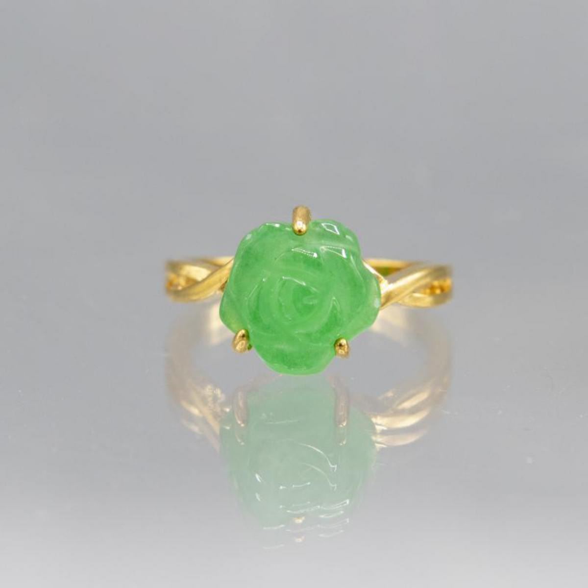 Lovly Hand Carved 5.45 Ct Jade Rose Ring Mounted In 14 kt. Gold Overlay.Due to the hardness of the stone, jade was also extremely difficult for craftsmen to work with. As such, jade was a symbol of power and status. This item is in good condition mounted in 14 kt gold overlay. Size: 7 3/4 .Approx. Net Weight 3 grams. Ring box in phote not included