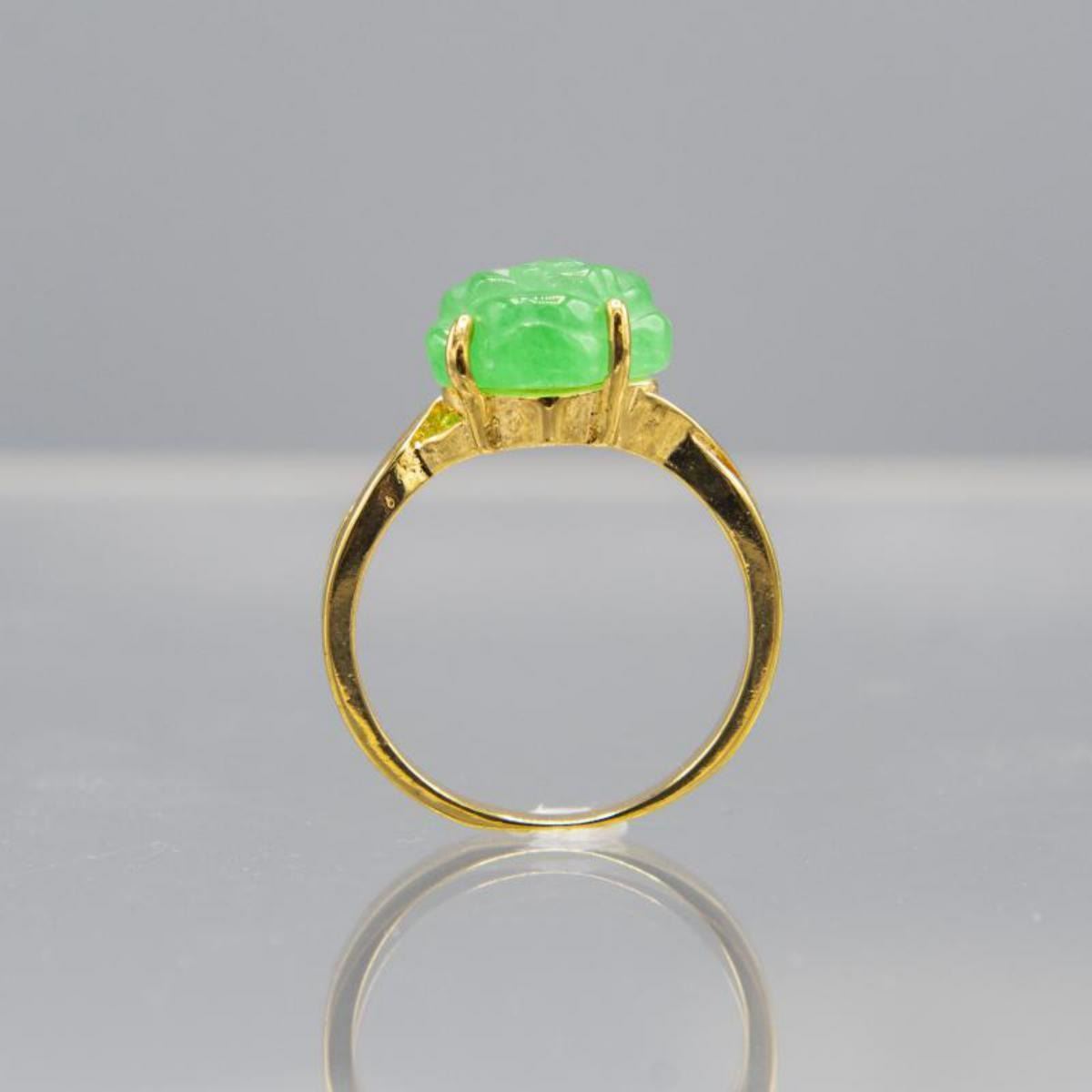 Lovly Hand Carved 5.45 Ct Jade Rose Ring Mounted In 14 kt. Gold Overlay.Due to the hardness of the stone, jade was also extremely difficult for craftsmen to work with. As such, jade was a symbol of power and status. This item is in good condition mounted in 14 kt gold overlay. Size: 7 3/4 .Approx. Net Weight 3 grams. Ring box in phote not included