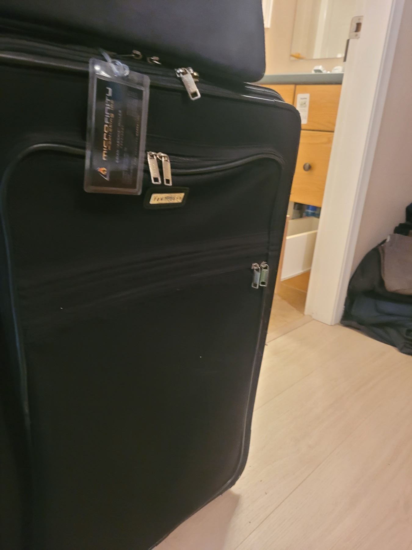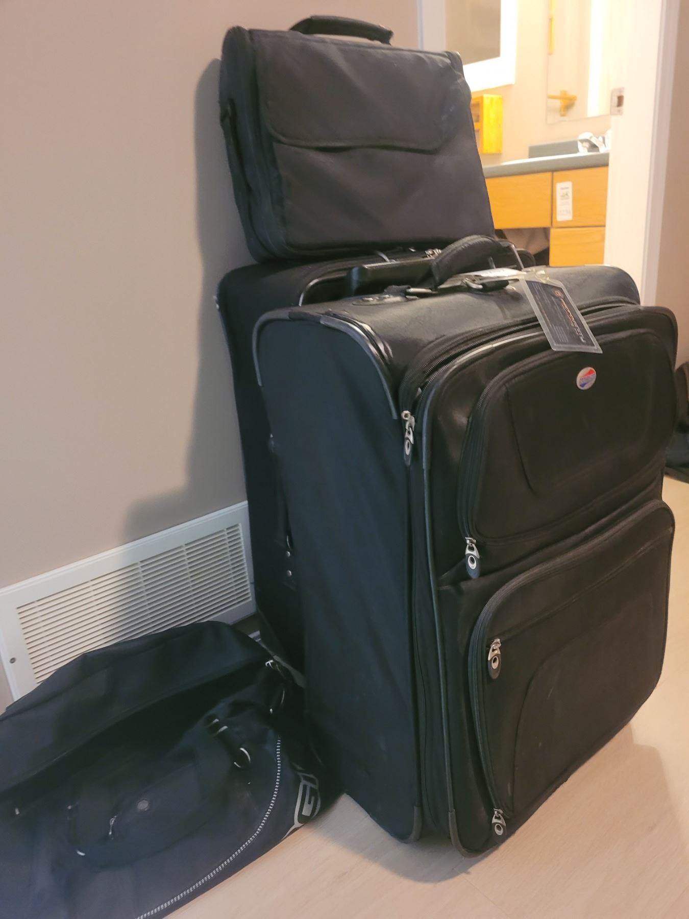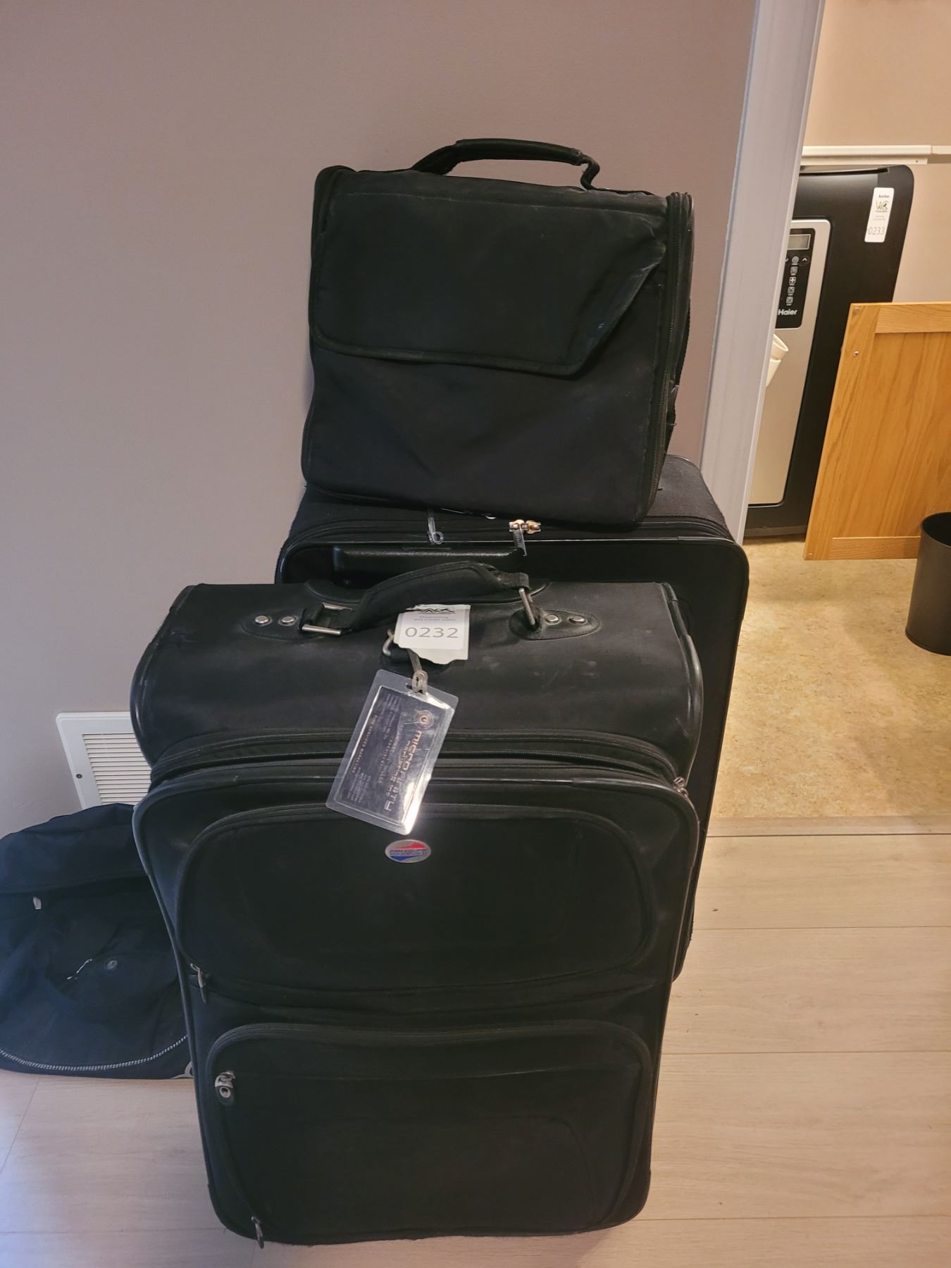 Van Huesen and American Tourister regular and carry on, two smaller satchels. Pick up 9-10