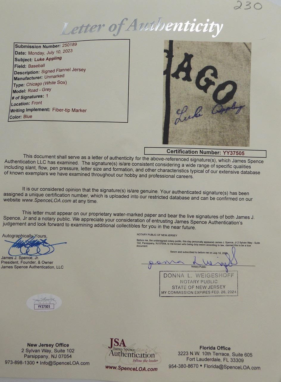 Luke Appling Signed Jersey. JSA COA