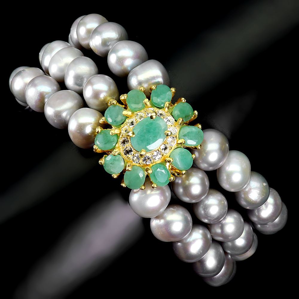 Luxury Emerald, 3 Rows Rare Grey Pearls and Topaz Bracelet in 925 Sterling Silver 14 K Yellow Gold Plated - Appraised Replacement Value CAD 2,611