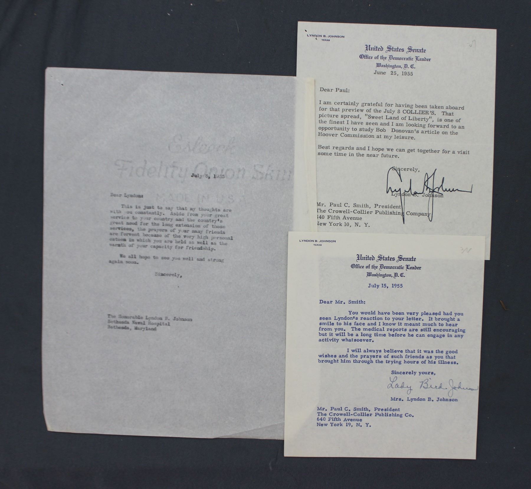 Lyndon Johnson suffered a near-fatal heart attack a week later, on July 2 1955. Included in this grouping is a carbon copy of a get-well letter from Paul C. Smith dated July 8, 1955.