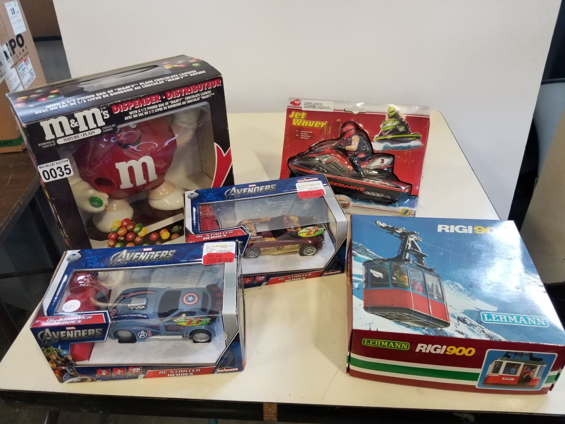 M&MS DISPENSER, 2 AVENGERS RC CARS, LEHMAN RIG 900 SKI LIFT SET AND JET WAVE JET SKI TOY