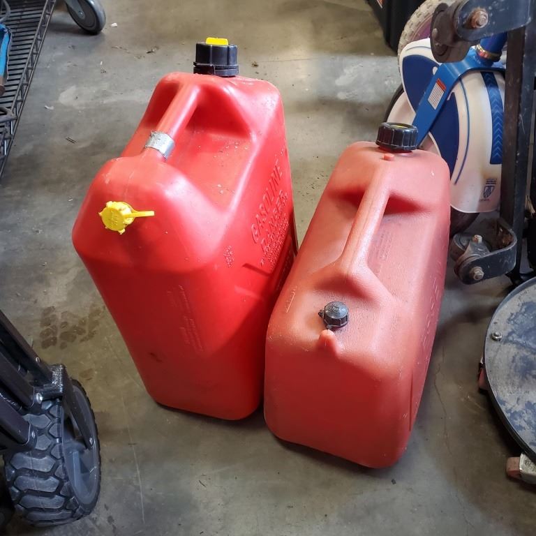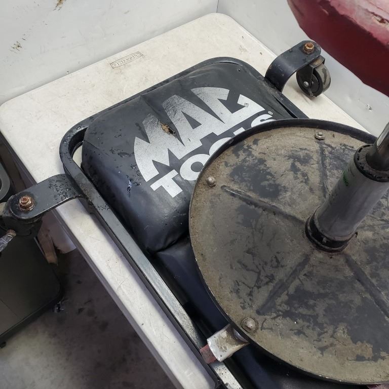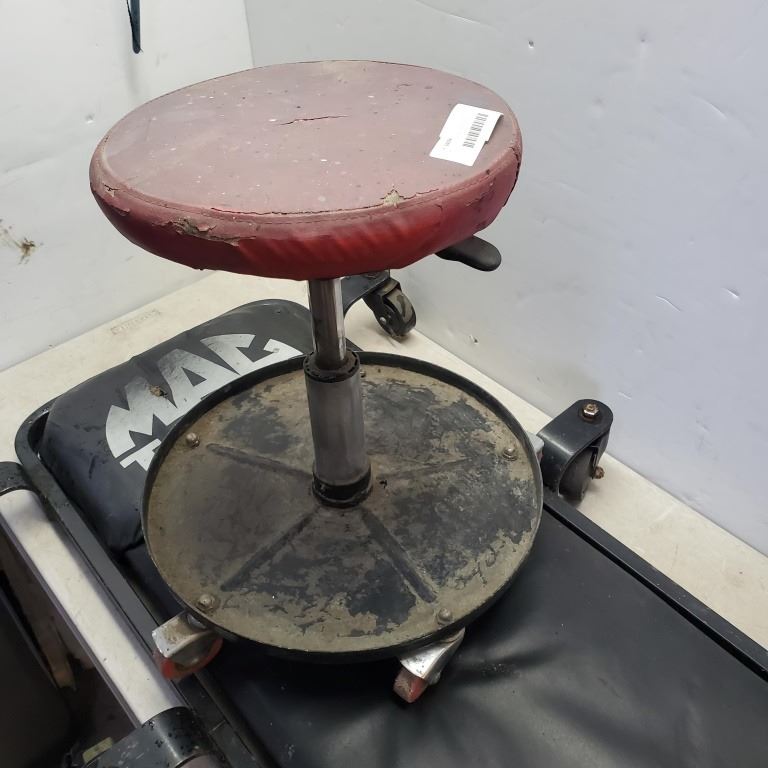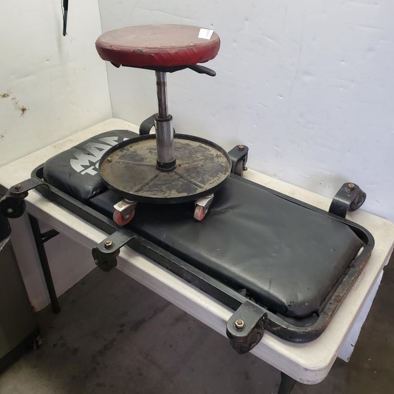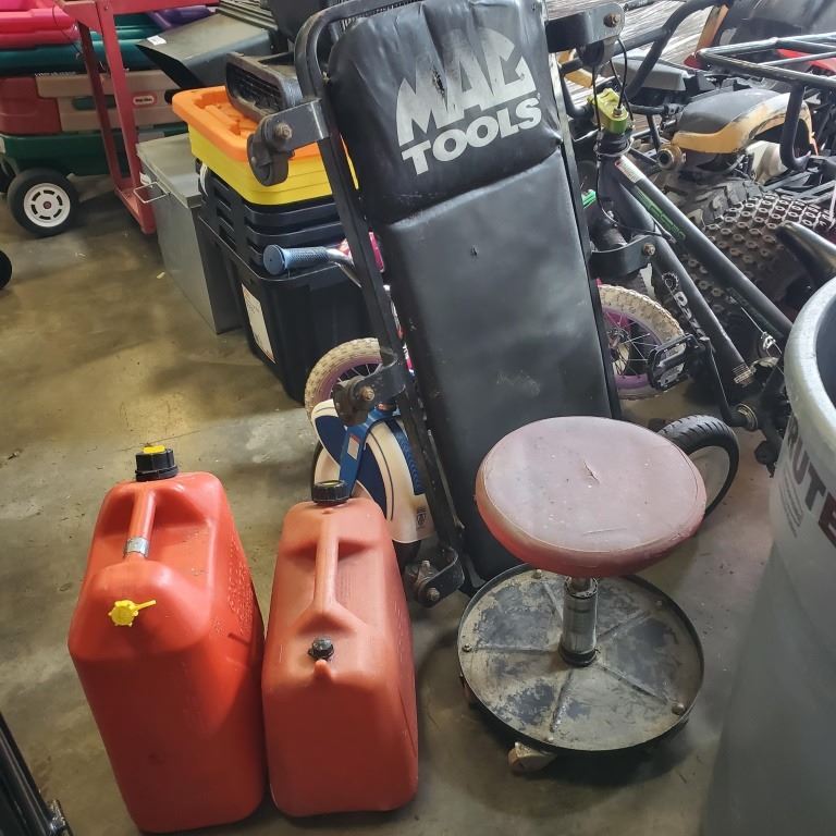 MAC TOOLS SHOP CREEPER AND MECHANICS STOOL AND 2 JERRY CANS