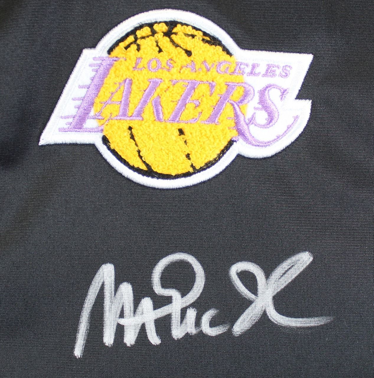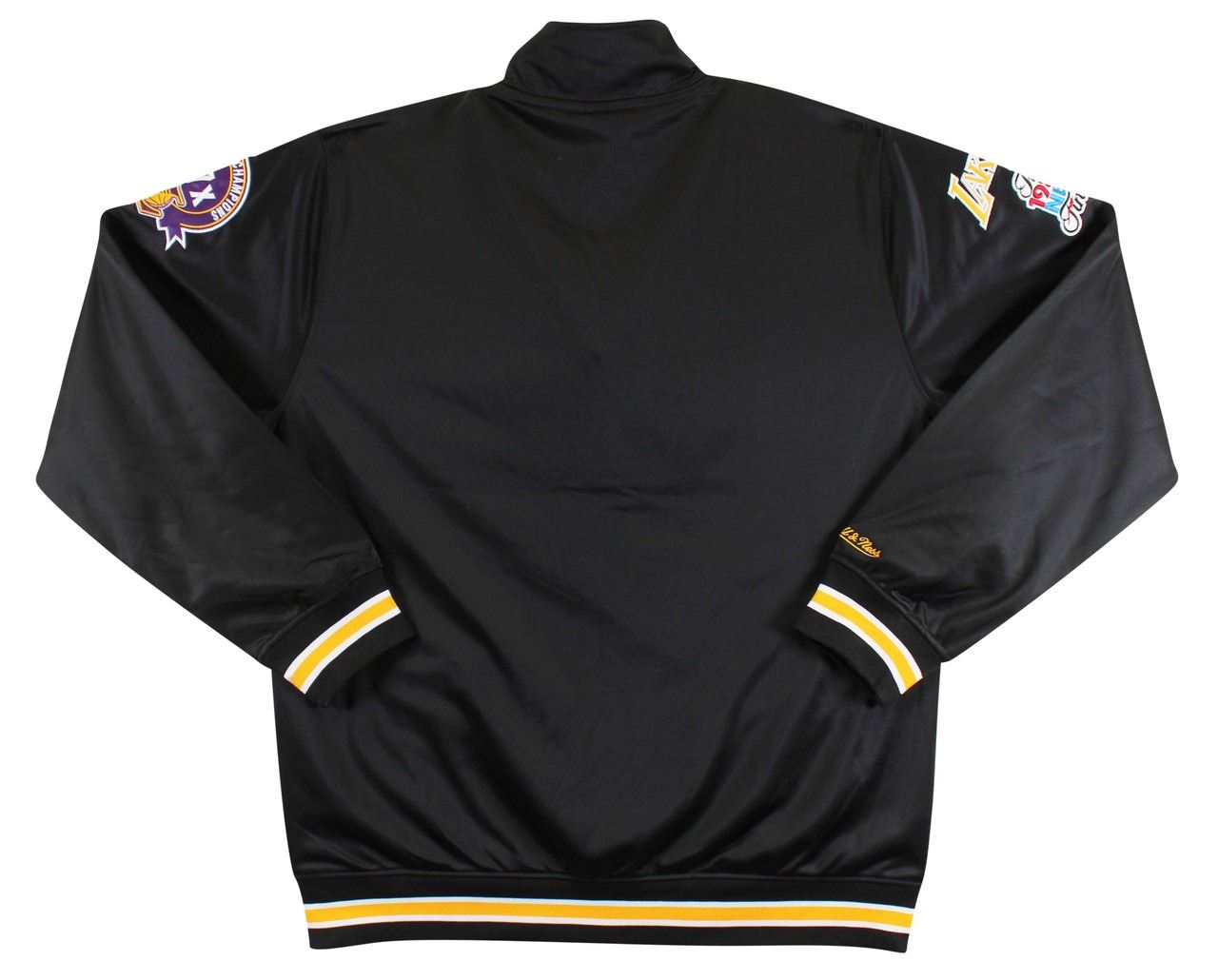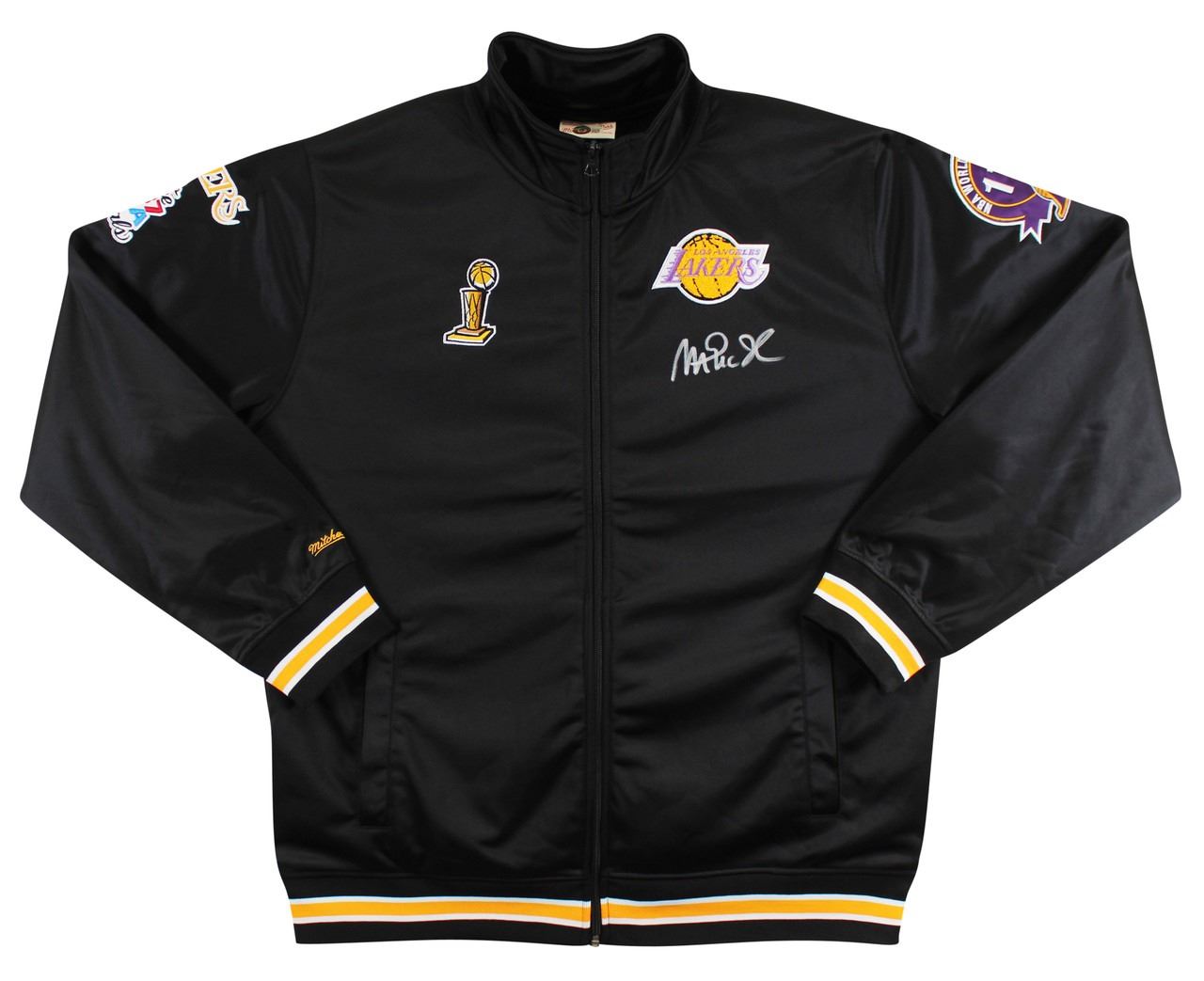 MAGIC JOHNSON SIGNED LA LAKERS BLACK M& N HWC BOMBER JACKET W/PATCHES (BAS WITNESSED)