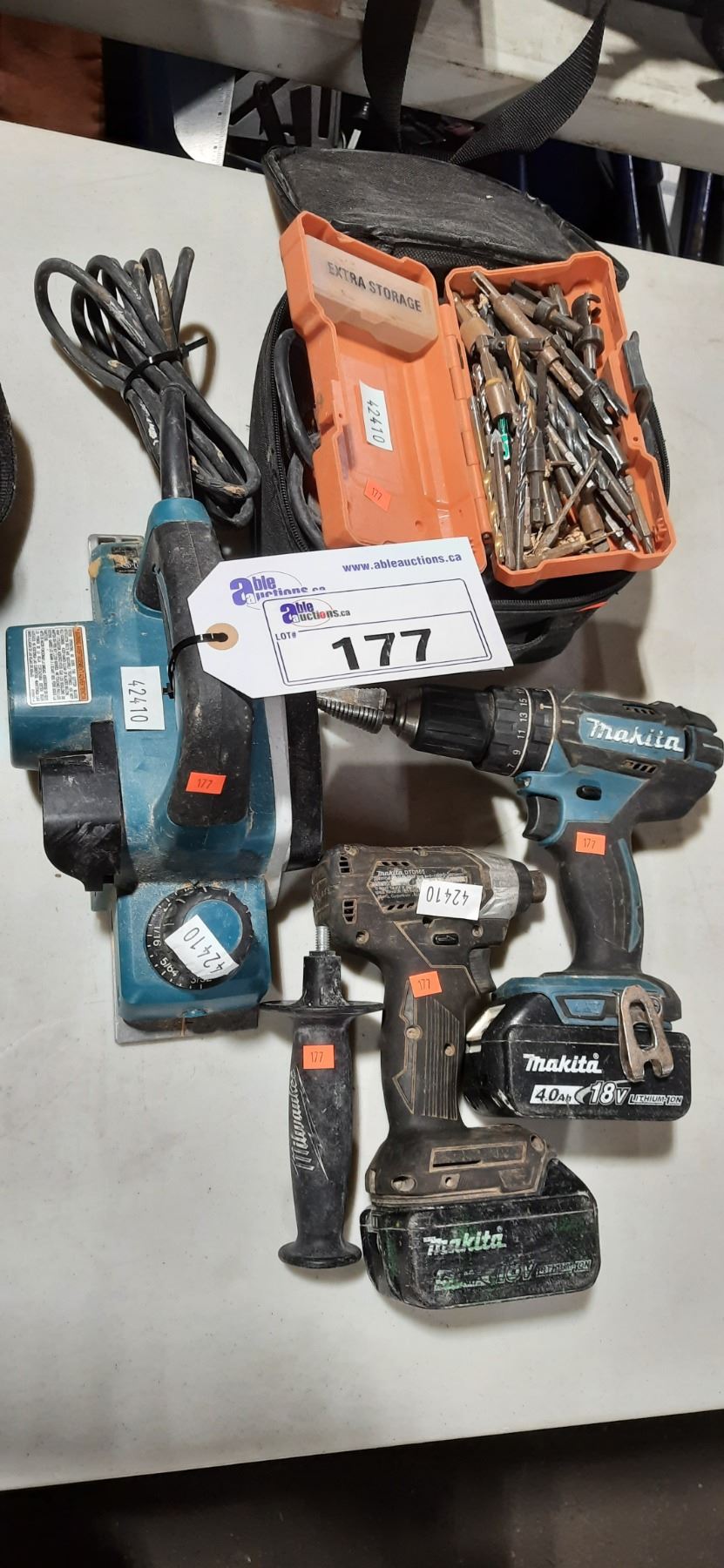 MAKITA CORDLESS DRILL, MAKITA CORDLESS IMPACT DRIVER WITH 2 BATTERIES, MAKITA ELECTRIC PLANER,