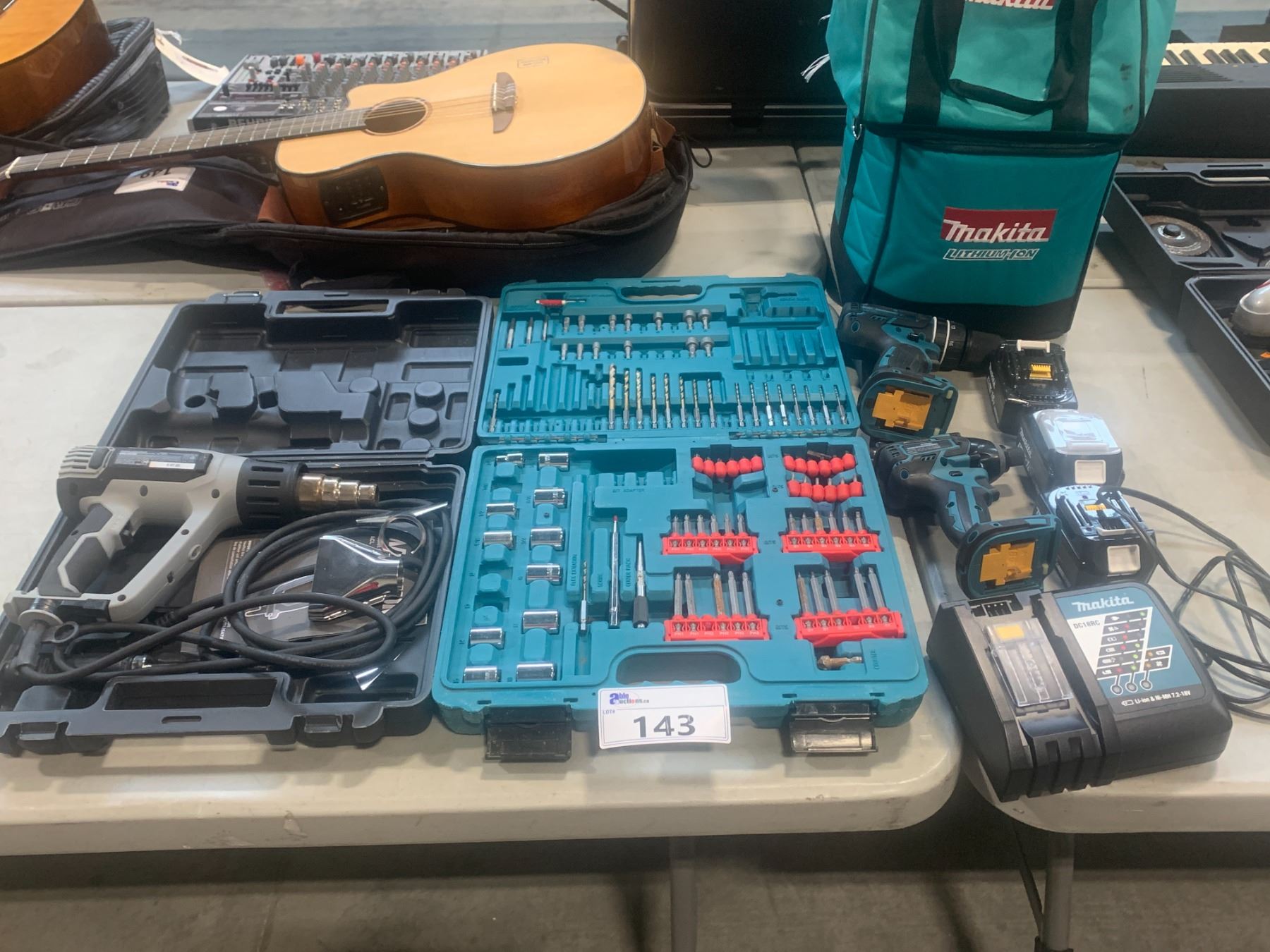 MAKITA TOOL BAG WITH CORDLESS IMPACT DRIVER, HAMMER DRILL, 3 BATTERIES AND CHARGER, MAKITA DRILL & DRIVER BIT ACCESSORY KIT(MISSING PIECES) AND MAXIMUM PRO-GRADE HEAT GUN WITH CASE