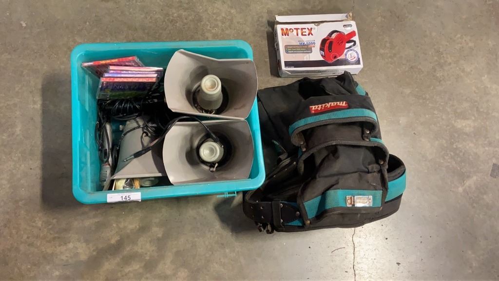 MAKITA TOOL BELT, PRICE GUN, PA SPEAKERS ETC