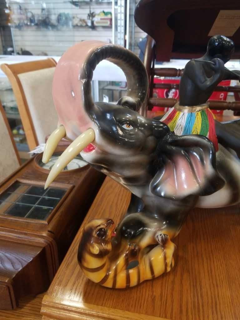 MAN FIGHTING TIGERS ON ELEPHANT FIGURE AND LADY DANCER FIGURE