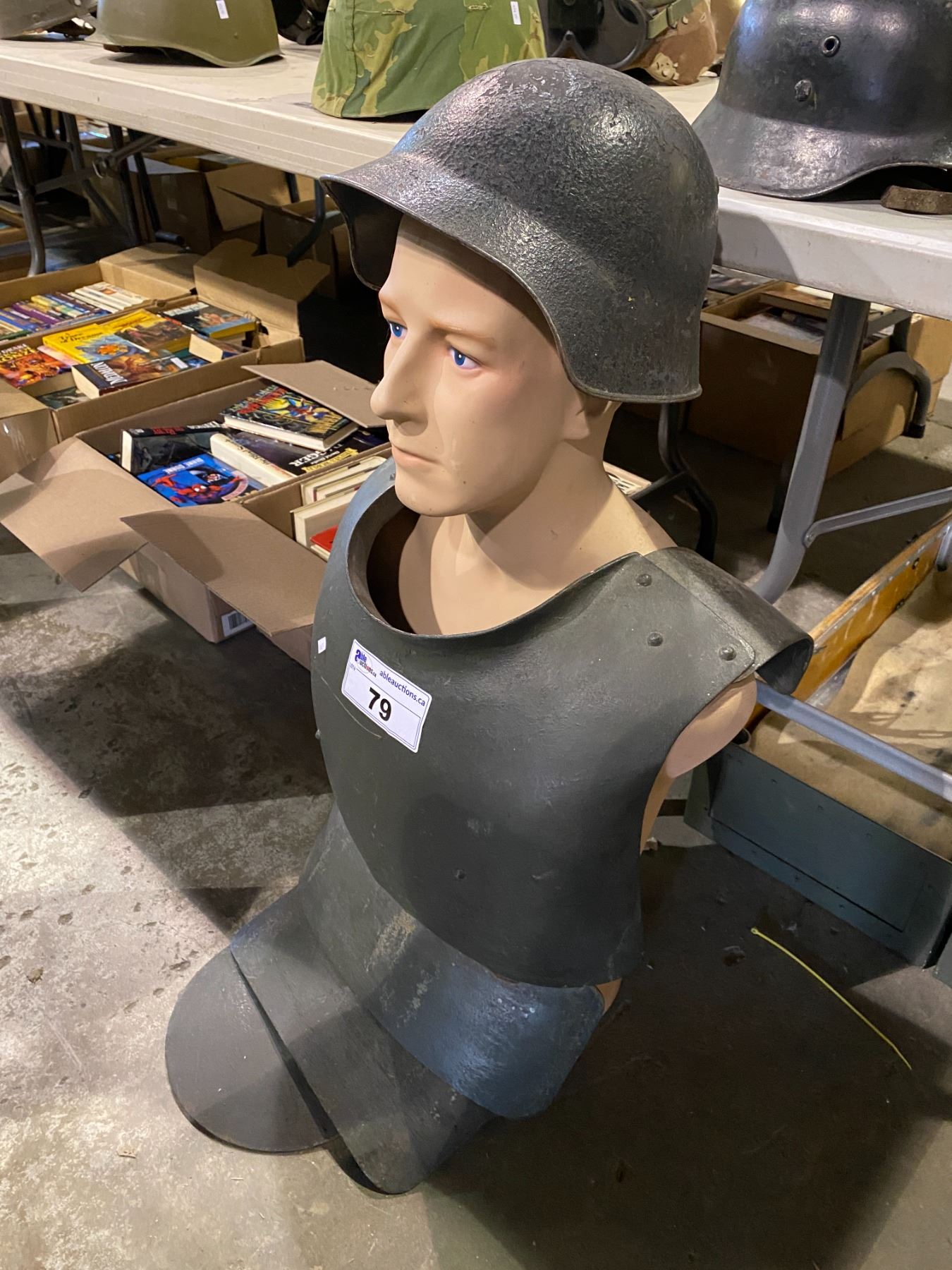 MANNEQUIN WITH BREAST PLATE ARMOR FOR MACHINE GUNNER AND VINTAGE MILITARY HELMET