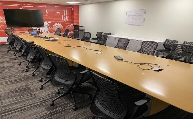 MAPLE NIENKAMPER 10'X5' WIDE BOARDROOM TABLE ADJUSTABLE TO 25' IN 5' INCREMENTS, COMES WITH BOX FORUM AND MEDIA PORTS