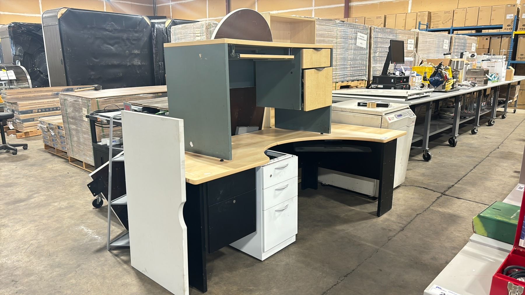 MAPLE TOP U SHAPED 2 DRAWER DESK ( 85"W X 42"D X 29.5"H ), MAPLE TOP RECTANGLE 2 DRAWER DESK ( 48"W X 24"D X 30"H ), MAPLE SHELVING UNIT ( 32"W X 14"D X 71"H ), GREY METAL 3 TIER CORNER SHELF, L SHAPE GREY DESK WITH WOOD TOP AND METAL LEGS ( APPROX. 77"W X 71"D X 28"H )