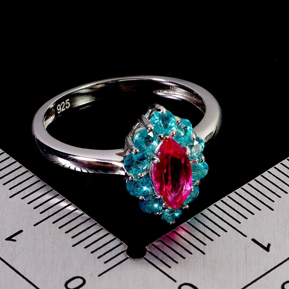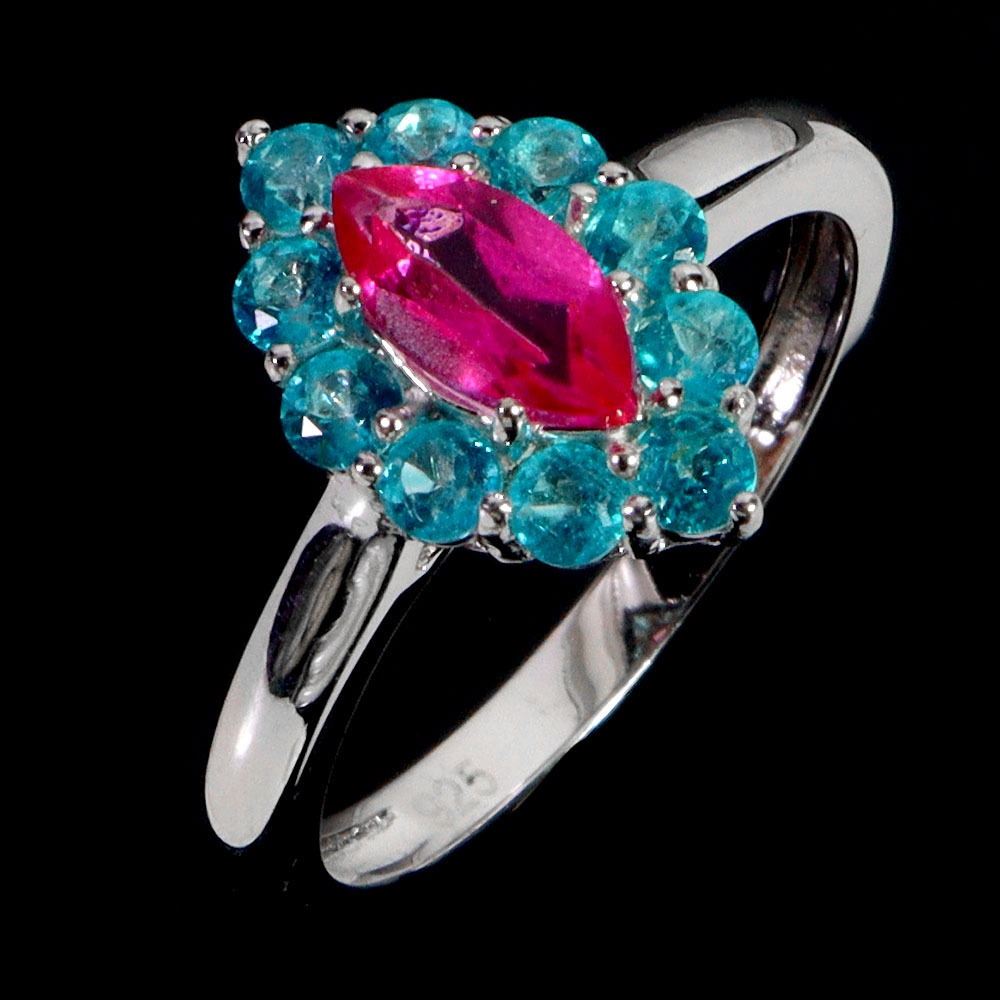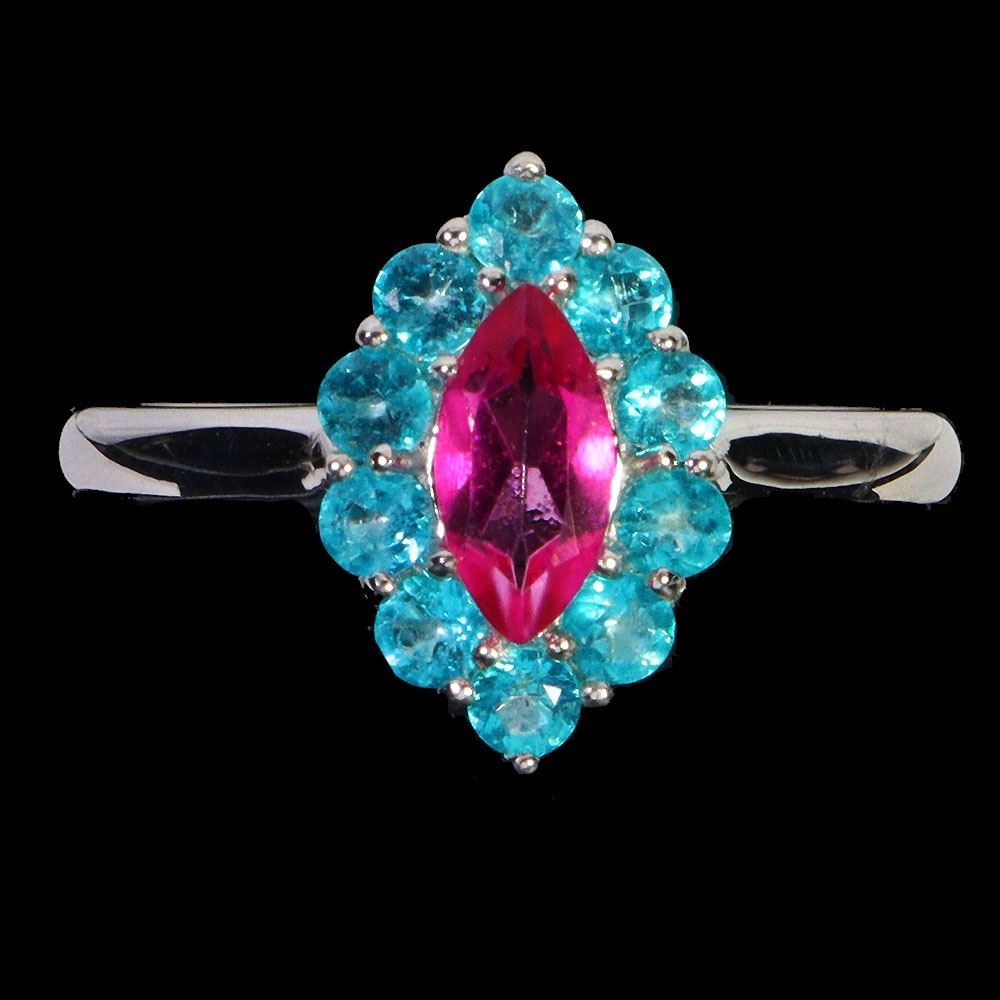 MARQUISE CUT PINK TOPAZ AND PARAIBA BLUE TOPAZ RING IN 14K WHITE PLATED GOLD OVER 925 STERLING SILVER - SIZE 8 - APPRAISED REPLACEMENT VALUE