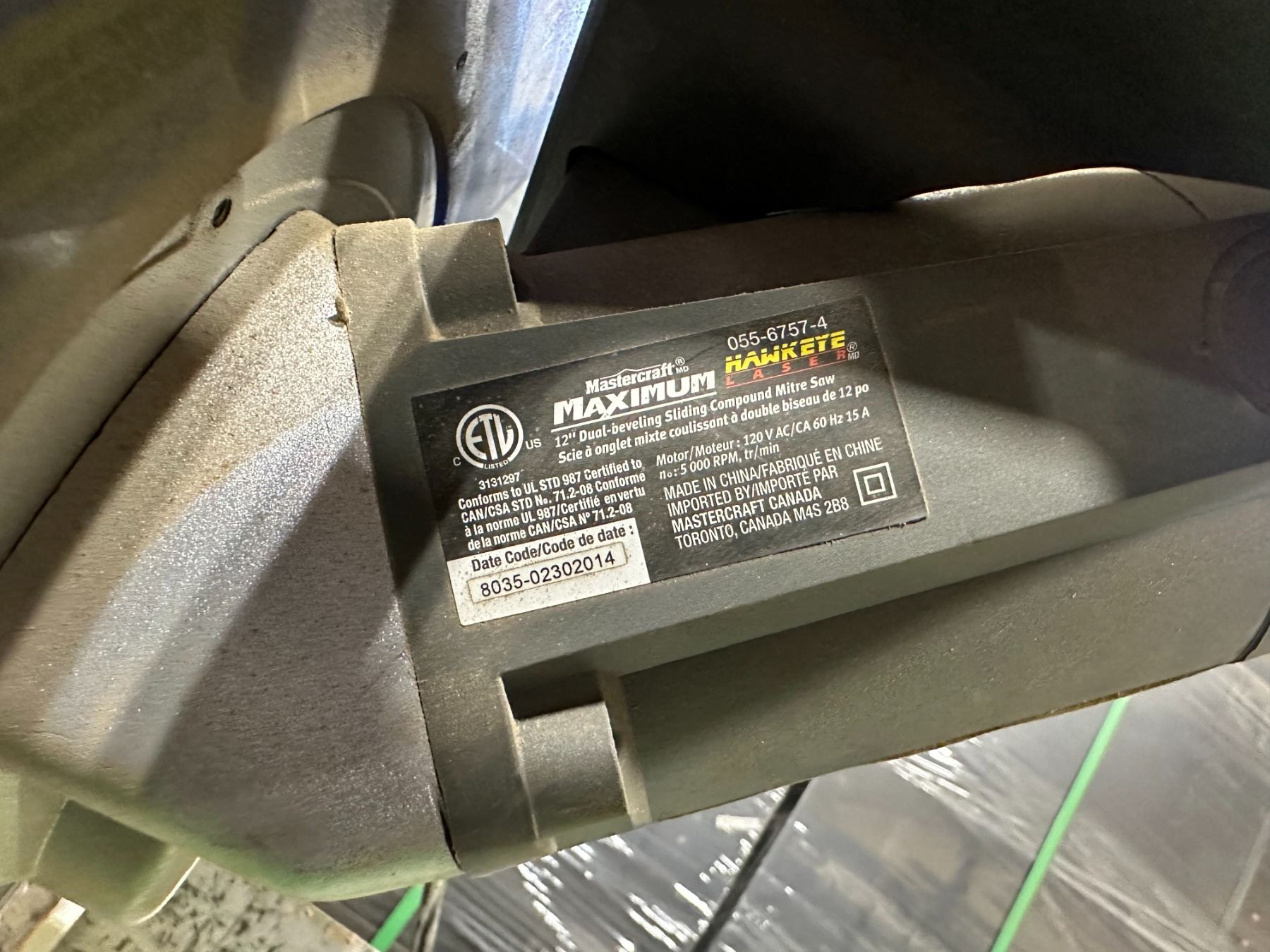 MASTERCRAFT MAXIMUM 12" DUAL BEVELING SLIDING COMPOUND MITER SAW ON METAL / WOOD MOBILE WORK TABLE