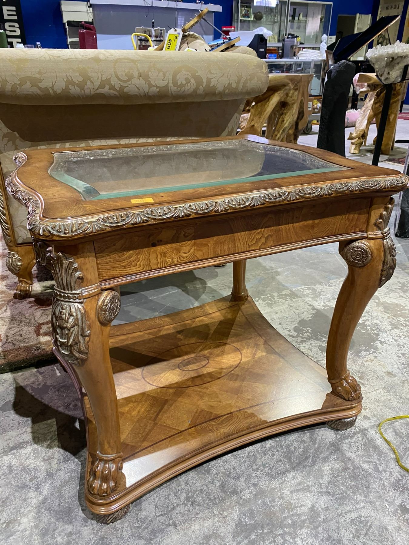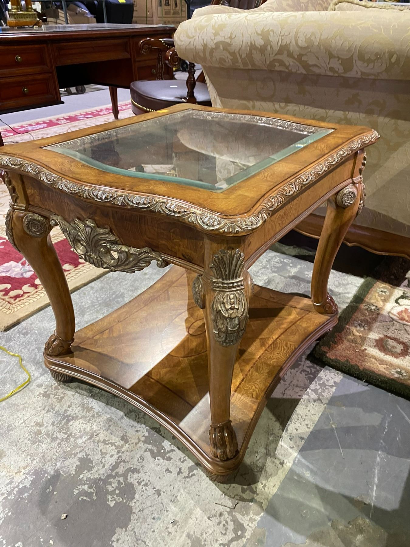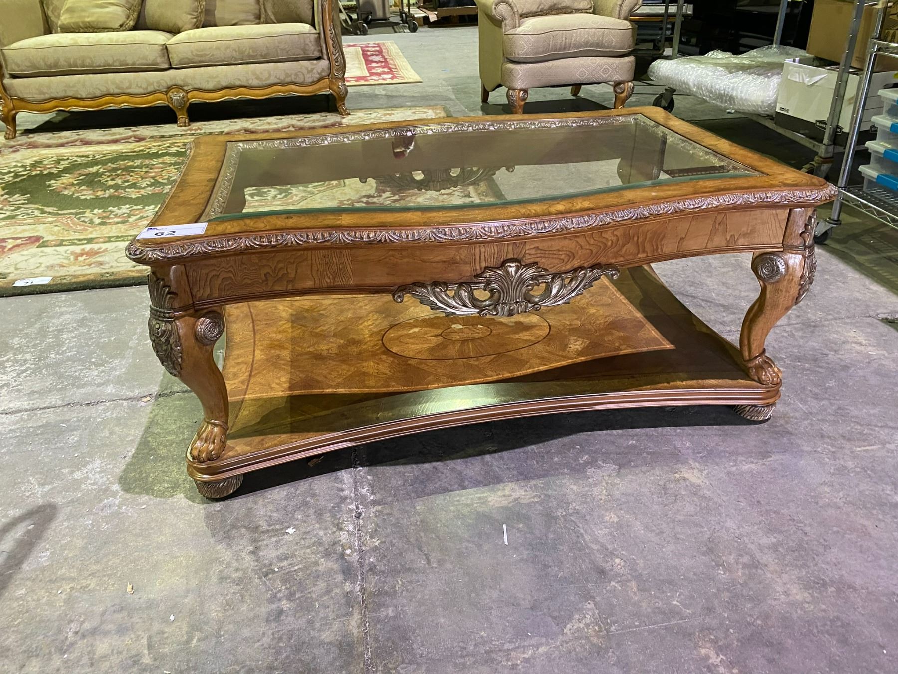 MATCHING COFFEE TABLE AND SIDE TABLE, HEAVILY CARVED WITH INLAID WOOD