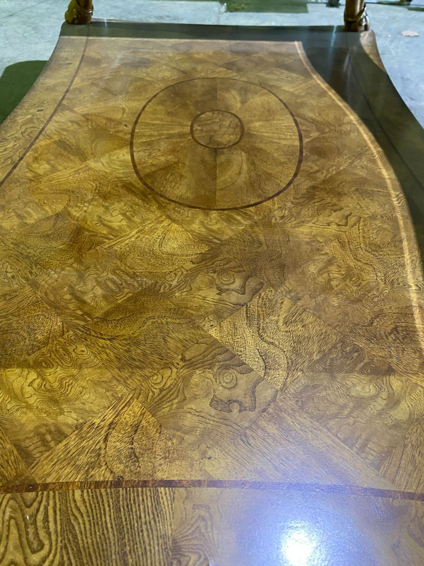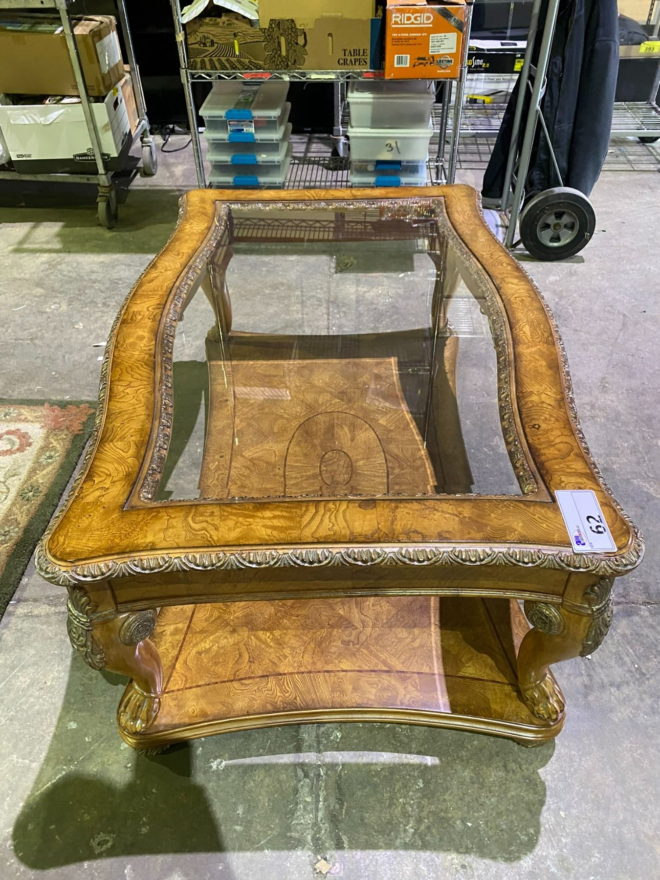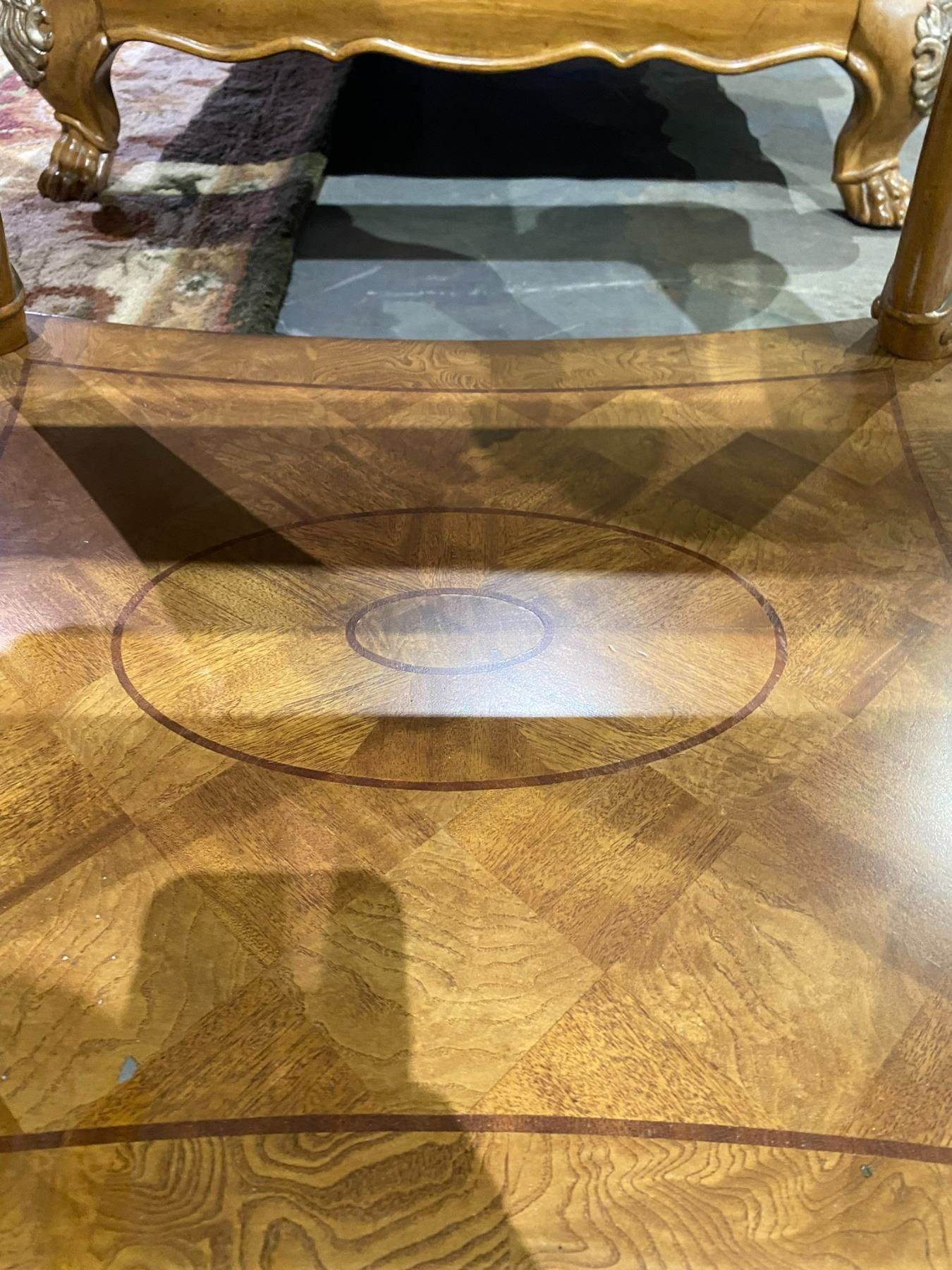 MATCHING COFFEE TABLE AND SIDE TABLE, HEAVILY CARVED WITH INLAID WOOD