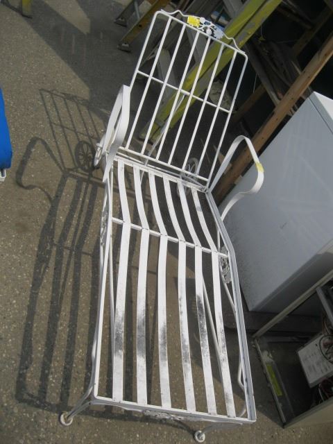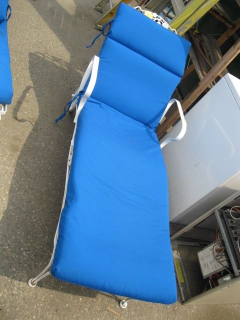 MATCHING WROUGHT IRON LOUNGE CHAIR WITH WHEELS & BLUE CUSHION