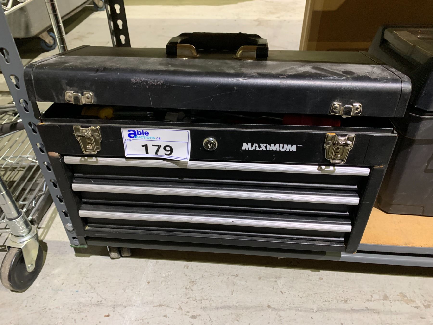 MAXIMUM 3 DRAWER FLIP TOP METAL 20.5" TOOLBOX WITH ASSORTED CONTENTS INCLUDING; CHISEL, RATCHET BITS, ALLEN KEY SET & MORE (NO KEYS)