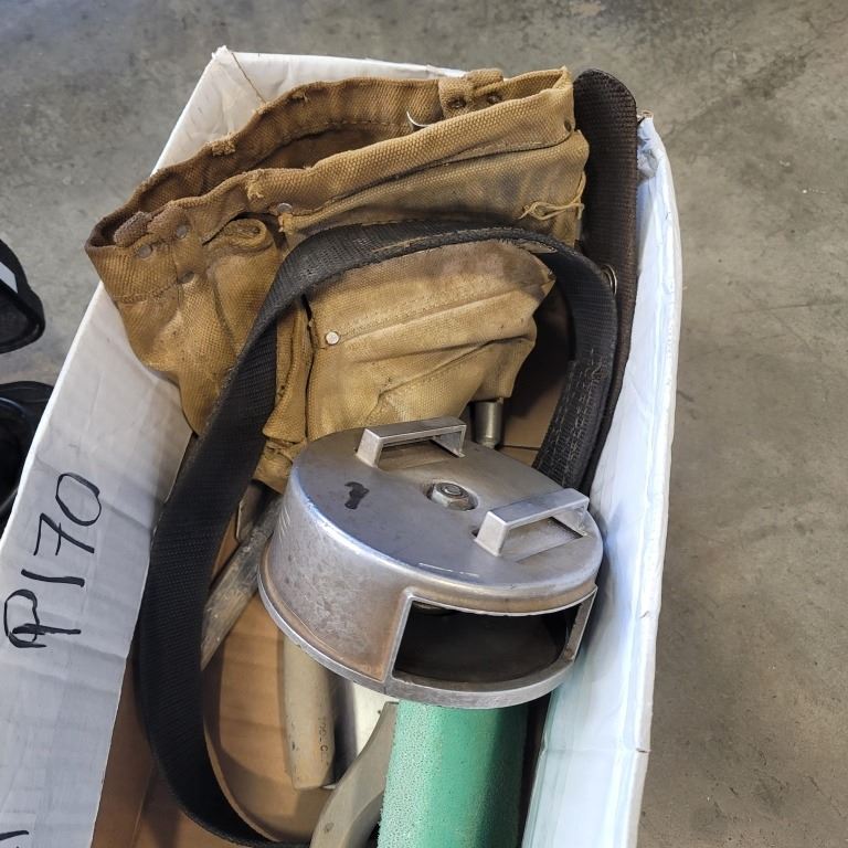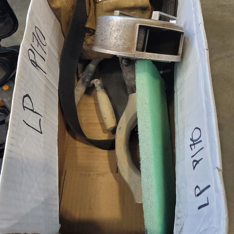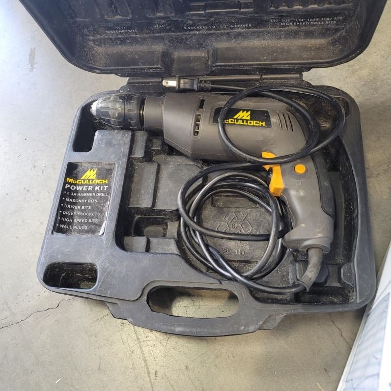 MCCULLOCH ELECTRIC DRILL, TOOL BELT AND BAG, DRYWALL TOOLS AND REBAR TIE WIRE REEL
