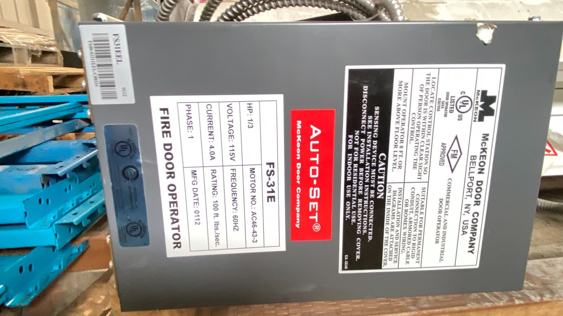 MCKKEON DOOR CO MODEL FS-31E SINGLE PHASE COMMERCIAL ROLL UP DOOR, APPROX 18' *LOCATED OFFSITE/RICHMOND, THU MAY 29 & FRI MAY 30 PICKUP ONLY