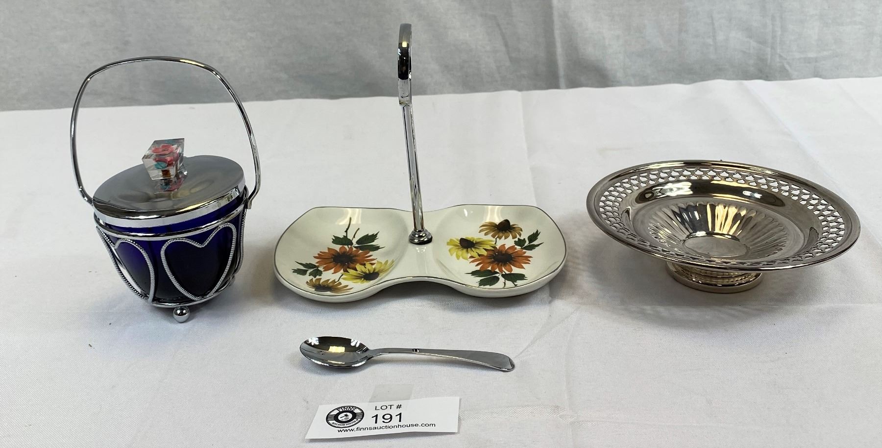MCM Handled Condiment Cobalt Dish With Spoon, Handled Tidbit TRAY And Silverplate Dish