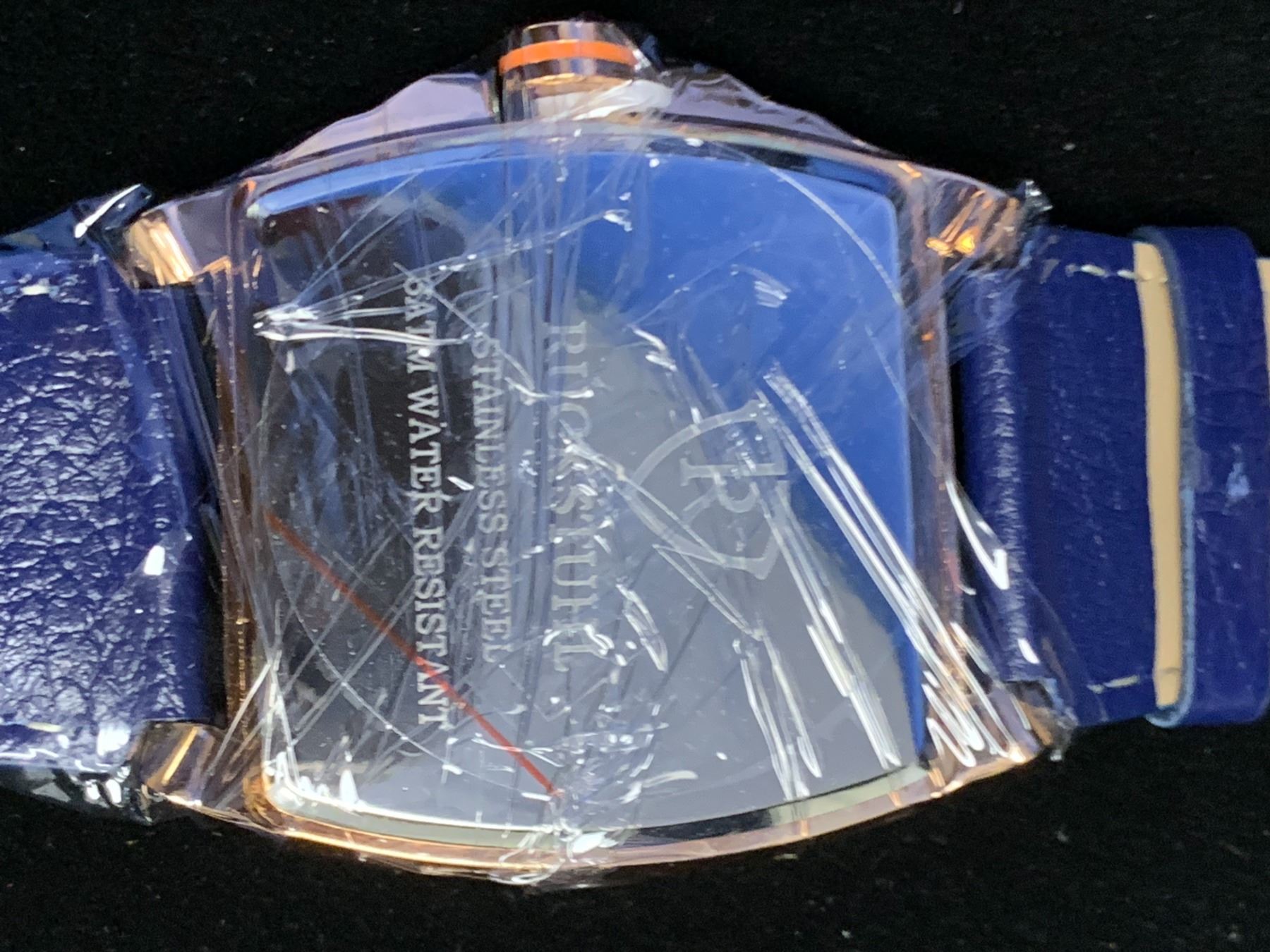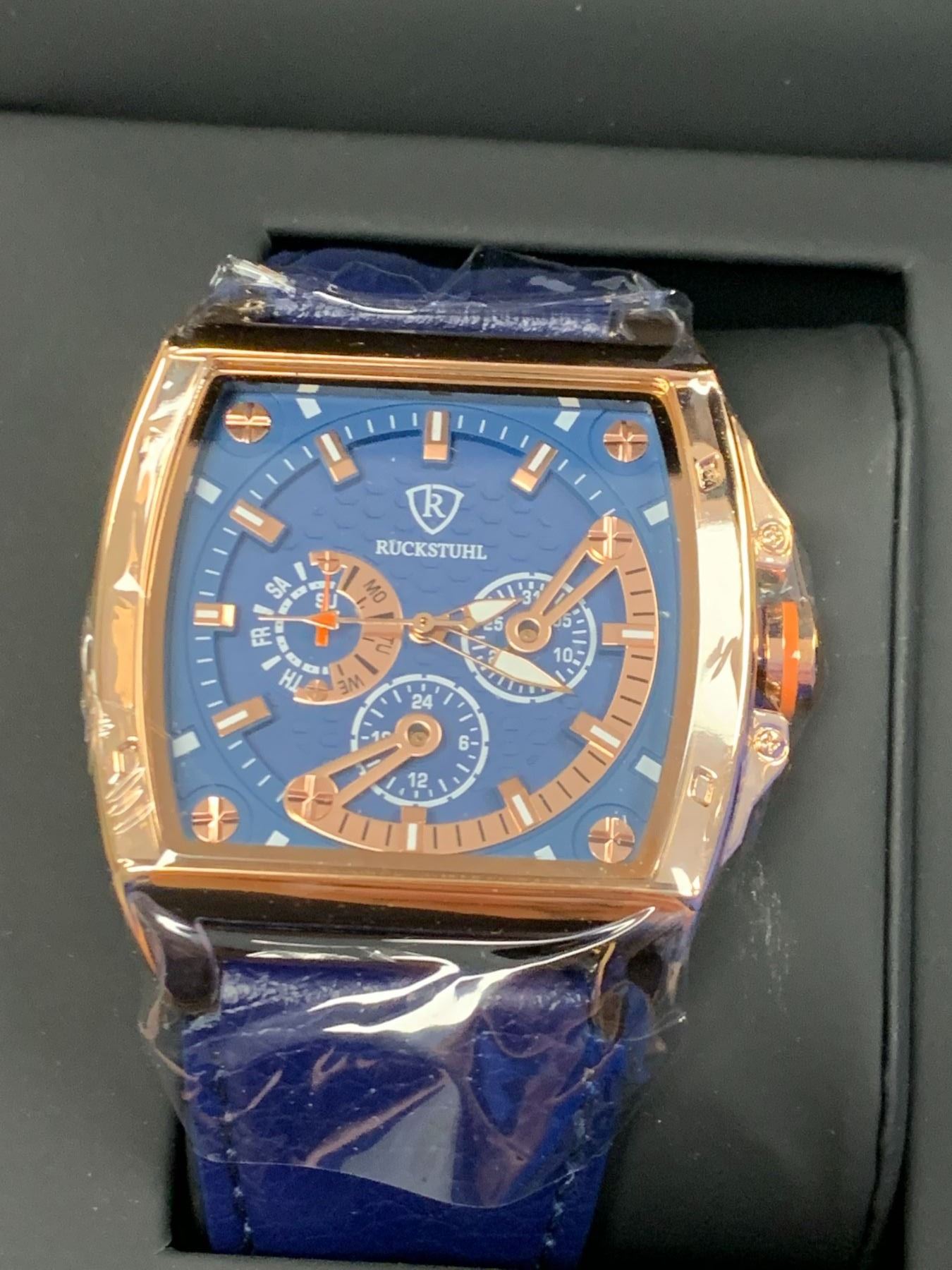 MEN'S RUCKSTUHL R300 CHRONOGRAPH WATCH, GOLD COLOUR CASE, BLUE MULTI FUNCTION DIAL 3ATM WATER RESISTANT, GENUINE LEATHER STRAP