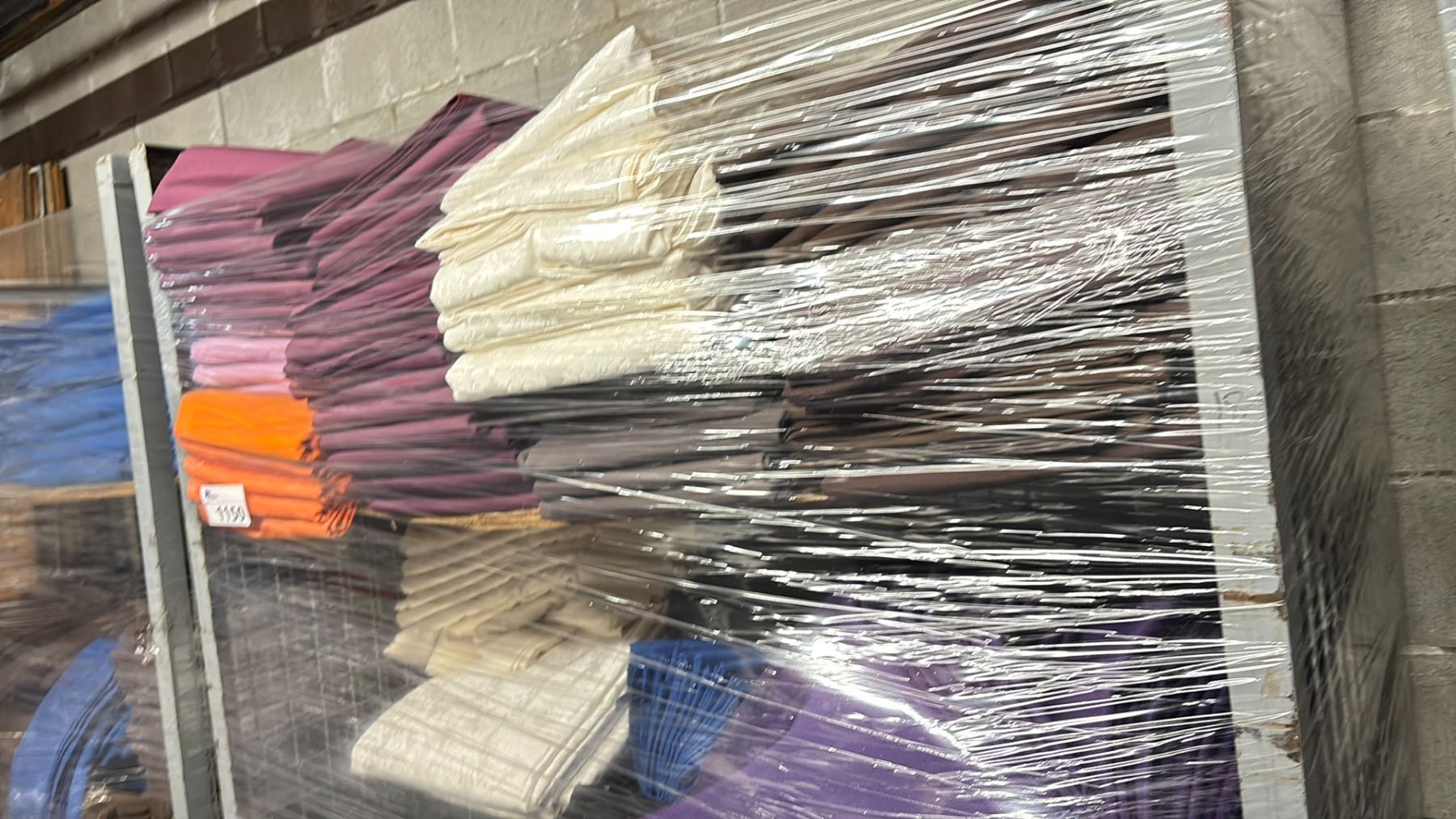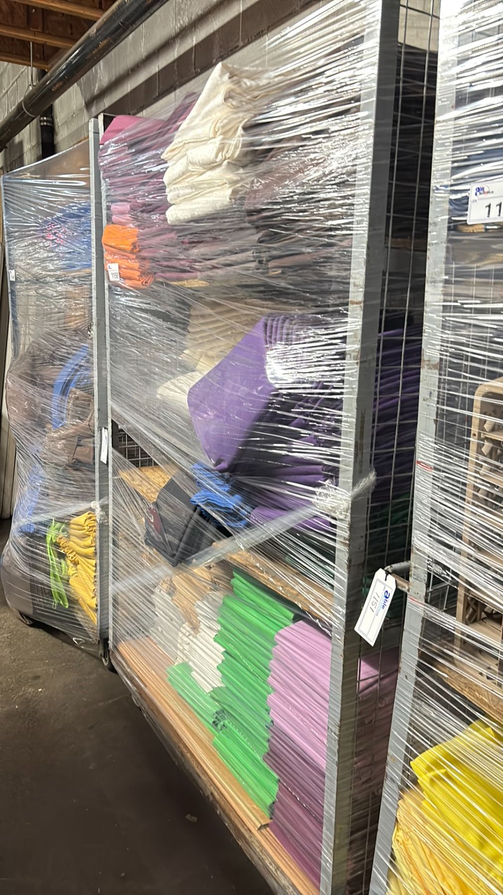 METAL 3 TIER COMMERCIAL MOBILE STORAGE RACK WITH ASSORTED COLOR PROFESSIONAL EVENT / BANQUET TABLE LINENS - RACK SIZE 53"W X 27"D X 81"H *RACK INCLUDED*