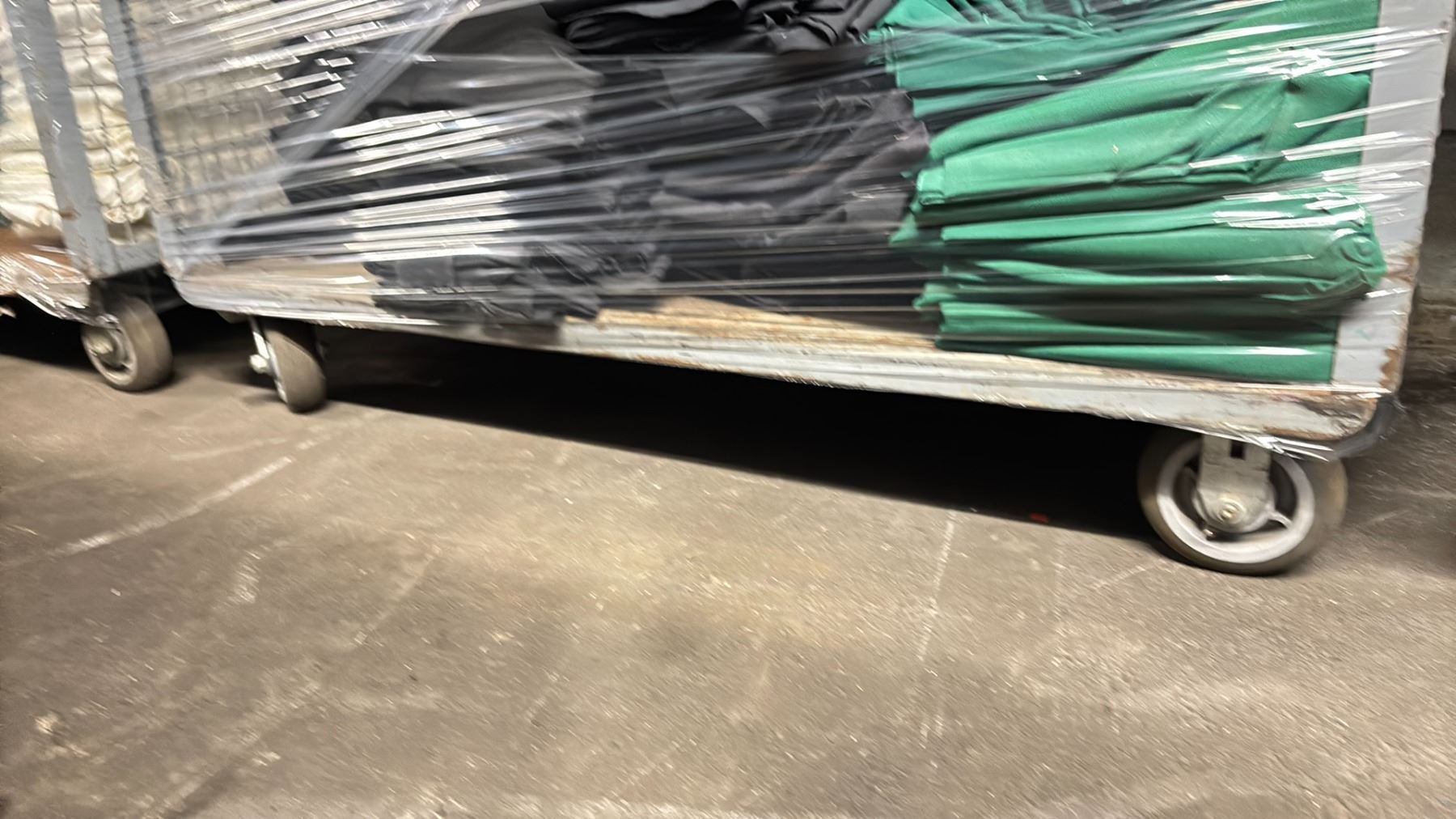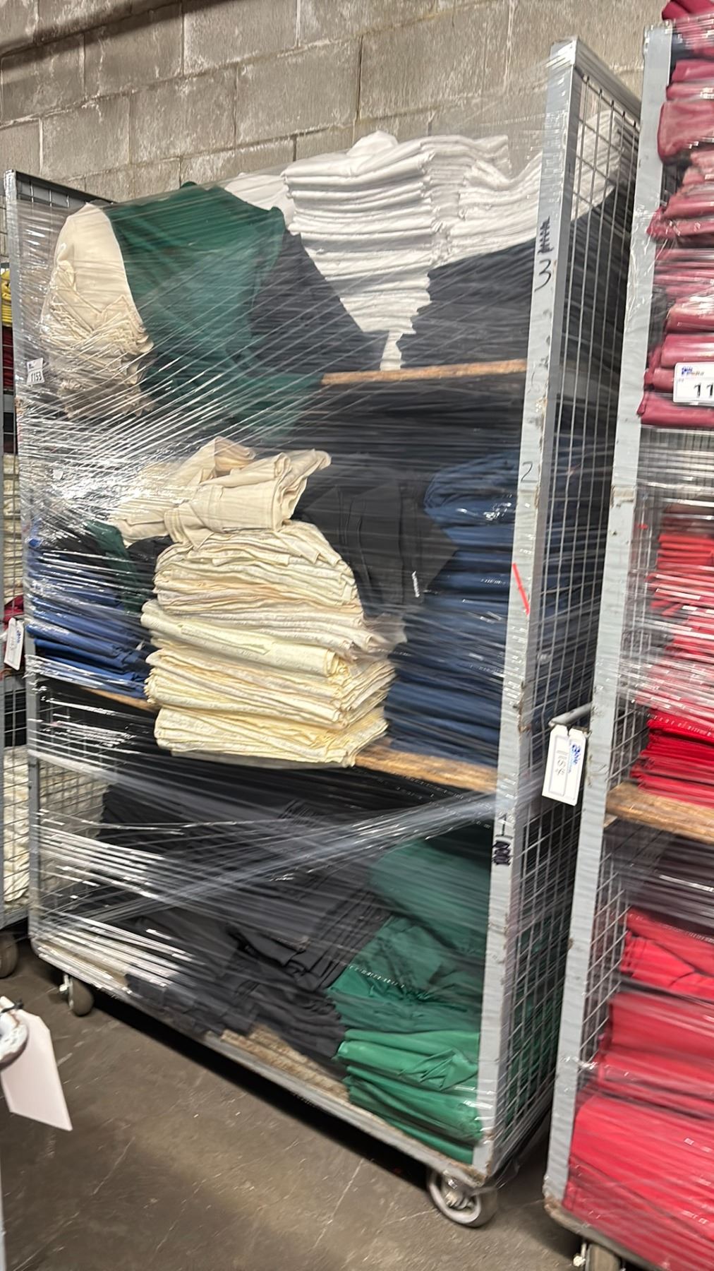 METAL 3 TIER COMMERCIAL MOBILE STORAGE RACK WITH ASSORTED COLOR PROFESSIONAL EVENT / BANQUET TABLE LINENS - RACK SIZE 53"W X 27"D X 81"H *RACK INCLUDED*