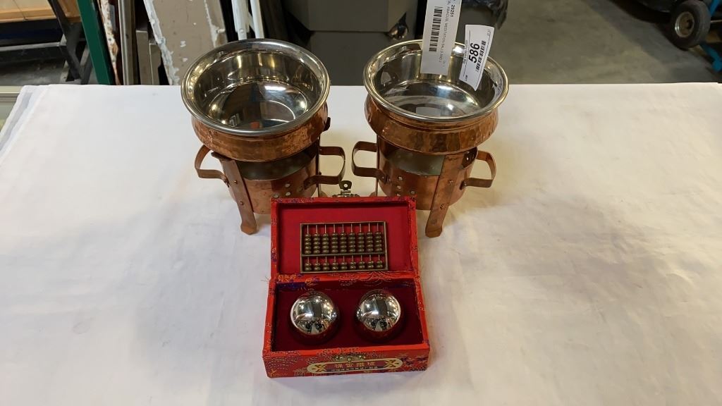METAL ABACUS, MEDITATION BALLS AND 2 COPPER WARMING STANDS