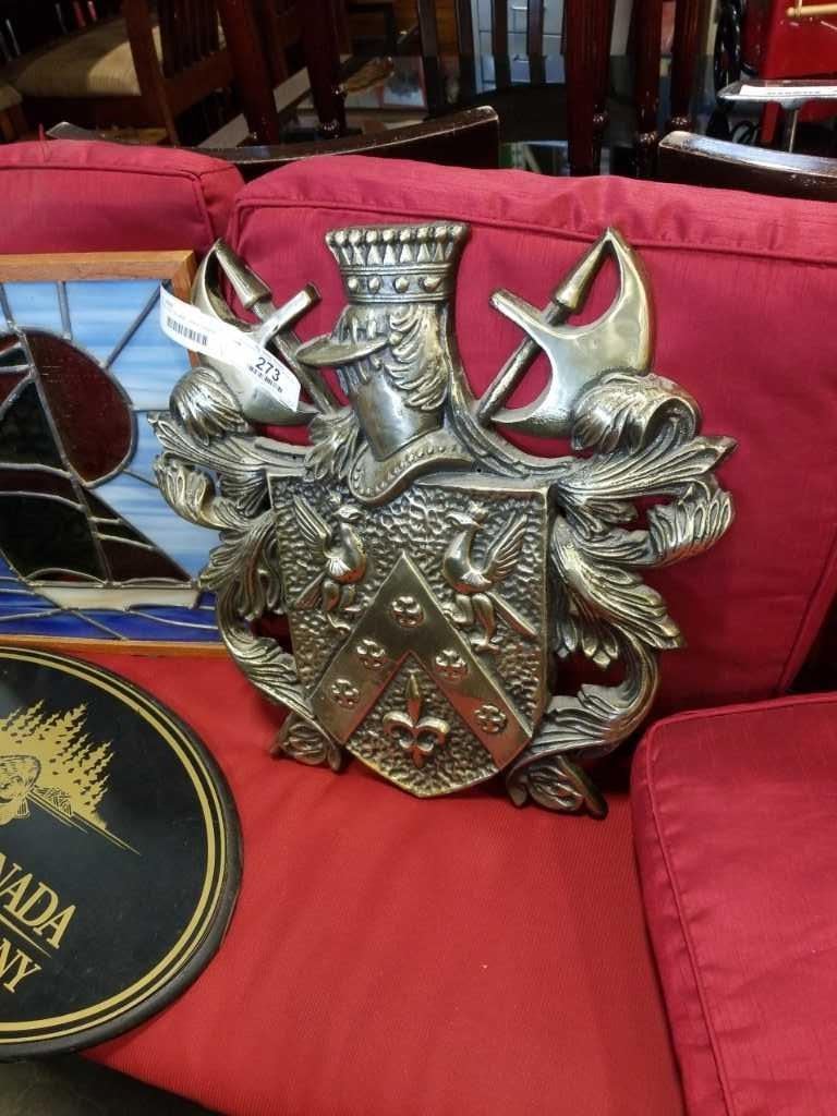 METAL COAT OF ARMS, UPPER CANADA BREWING COMPANY SIGN AND LEADED GLASS SAIL BOAT PANEL