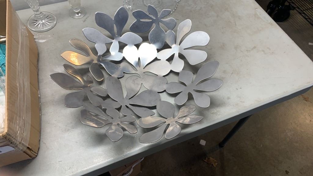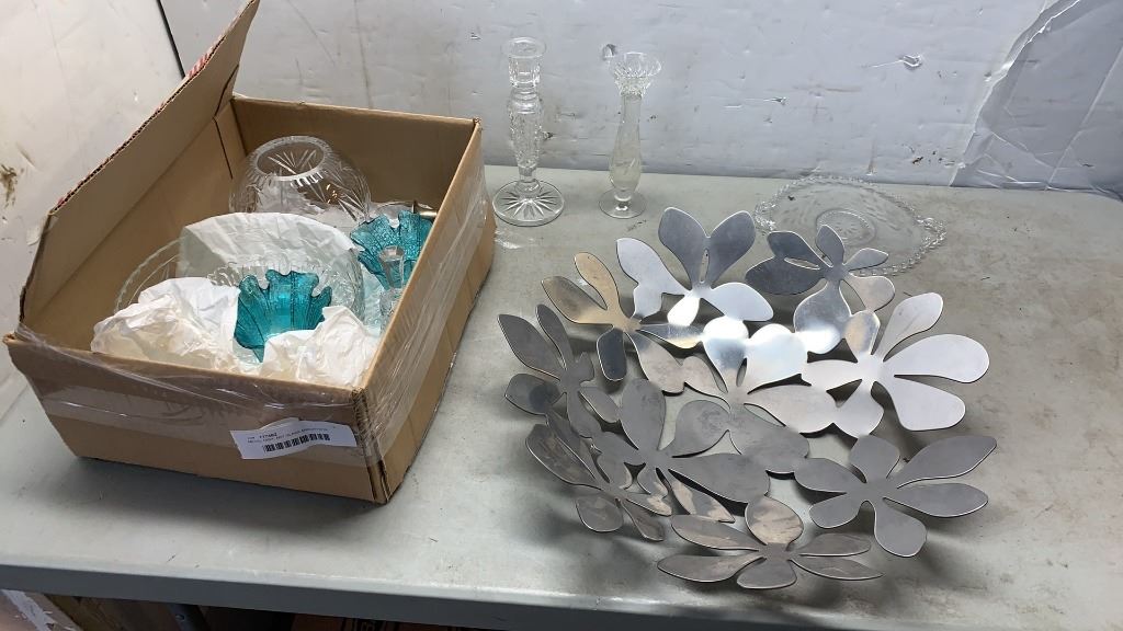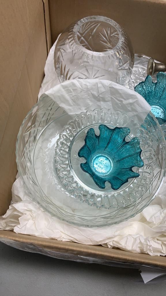 METAL DISH, ART GLASS ANDCRYSTAL VASES, BOWLS