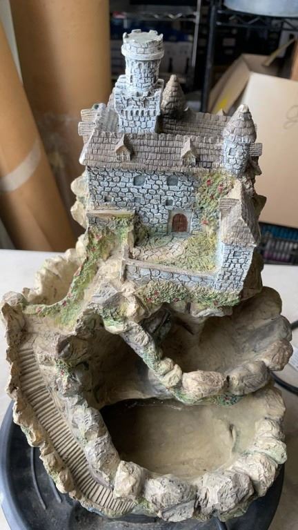 METAL HORSE DRAWN CART FIGURE, ARTIFICIAL BONSAI TREE AND CASTLE FIGURE WITH FOUNTAIN BASE