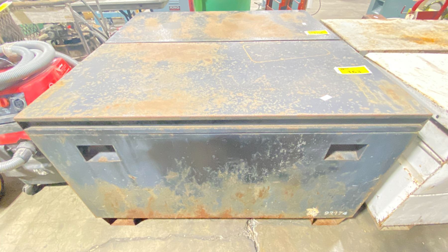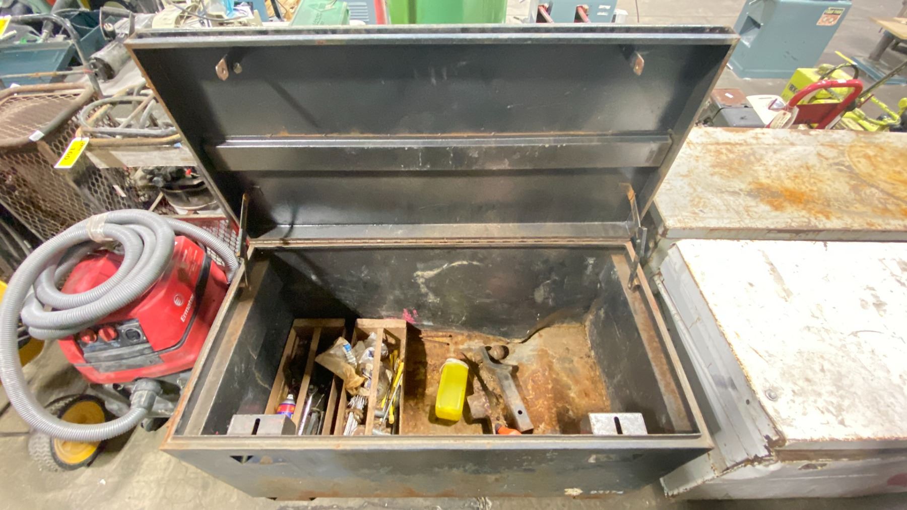 METAL JOBSITE TOOLBOX WITH ASSORTED CONTENTS INCLUDED APPROX 4'L X 2'D X 2.3'H