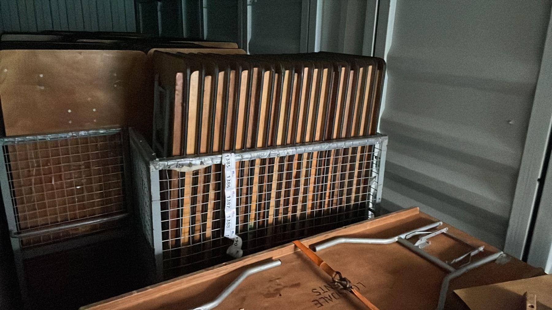 METAL MOBILE TRANSPORT CART WITH 20 6'L WOODEN COMMERCIAL EVENT / BANQUET FOLDING TABLES *MUST TAKE ALL*