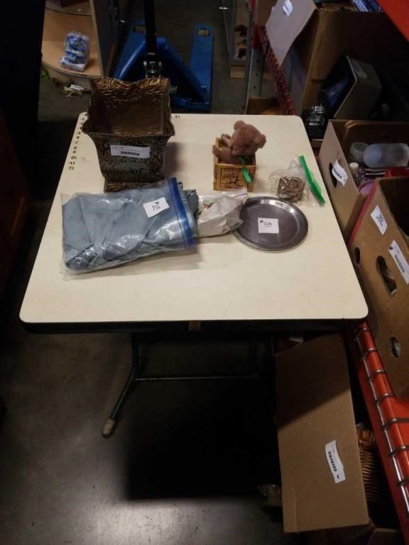 METAL PLANTER, AQUA PILLOW CASES, SMALL SERVING PLATE, TEDDY BEAR AND CRATE, ORNATE INLAID JEWELRY B