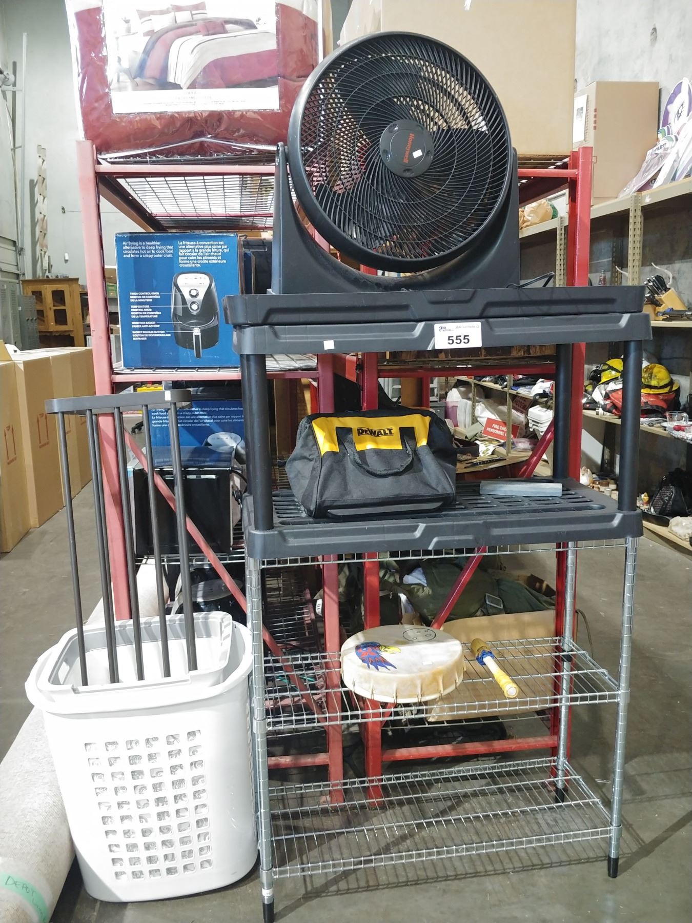 METAL SHELF WITH CONTENTS, PLASTIC SHELF, HONEYWELL FAN AND MORE