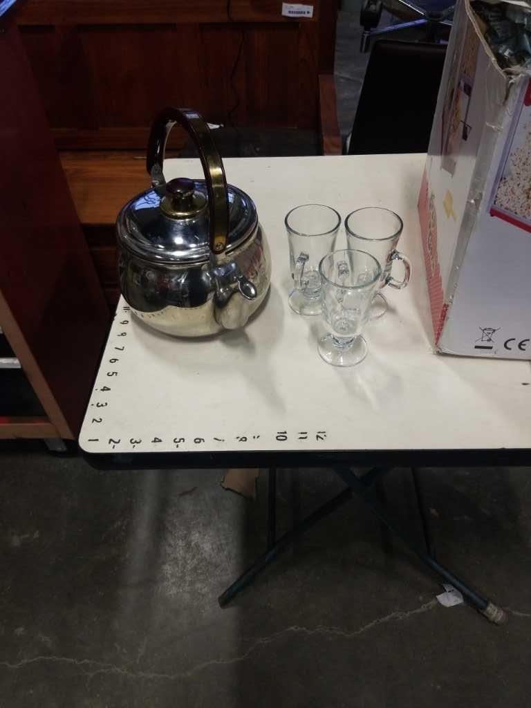 METAL TEAPOT, GLASS MUGS, GLASS CREAM AND SUGAR