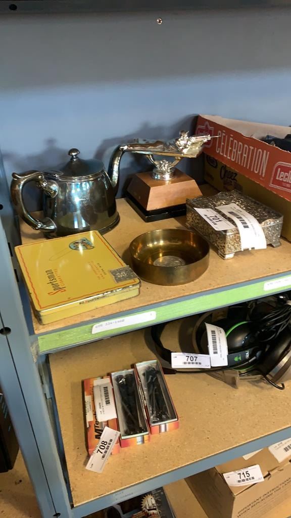 METAL TEAPOT, JEWELRY BOX, SHOOTING TROPHY, BRASS TRAY AND SPORTSMAN CIGARETTE TIN