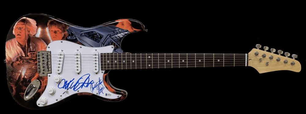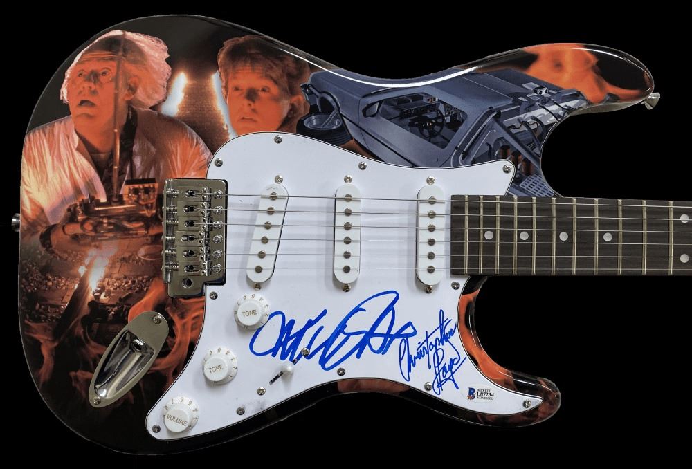 MICHEAL J FOX AND CHRISTOPHER LLOYD 1/1 SIGNED HAND PAINTED BTTF GUITAR ( BECKETT COA)