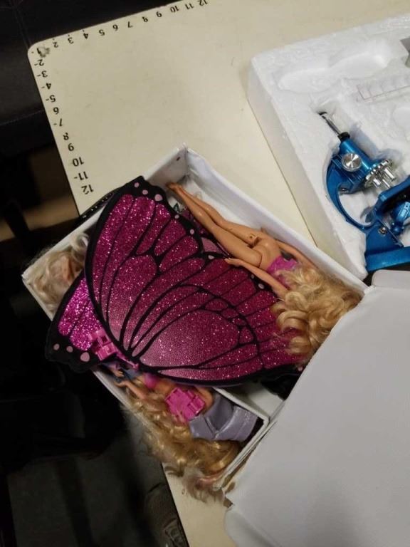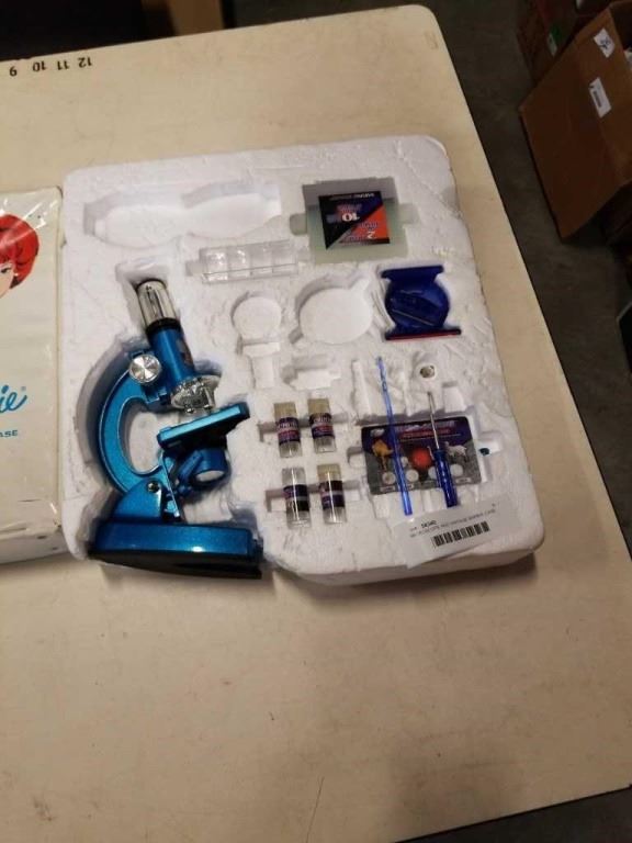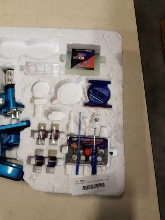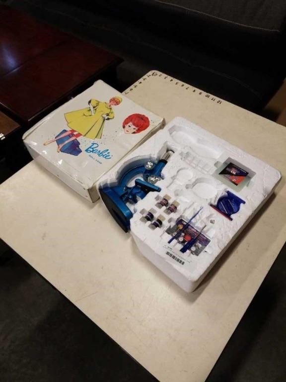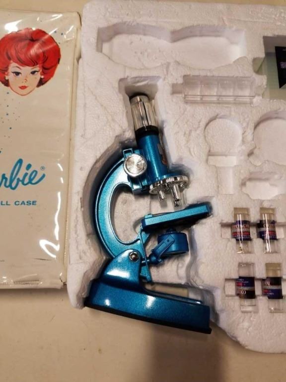 MICROSCOPE AND VINTAGE BARBIE CASE WITH DOLLS AND ACCESSORIES
