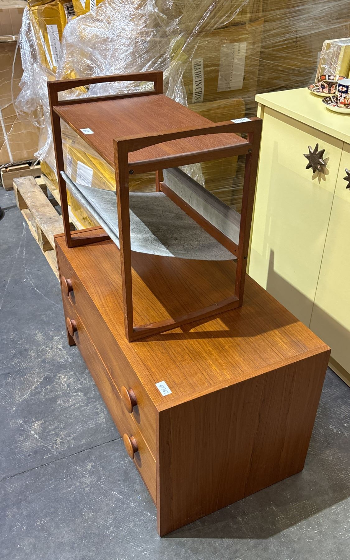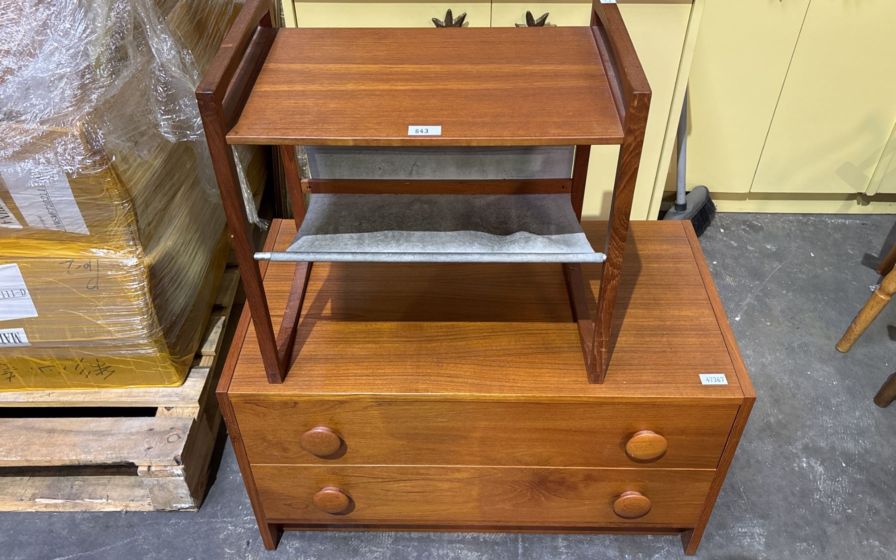 MID CENTURY MODERN ANTIQUE NEWSPAPER HOLDER (18.5" X 11.5" X 15") & 2-DRAWER CABINET (29.5" X 16" X 16")