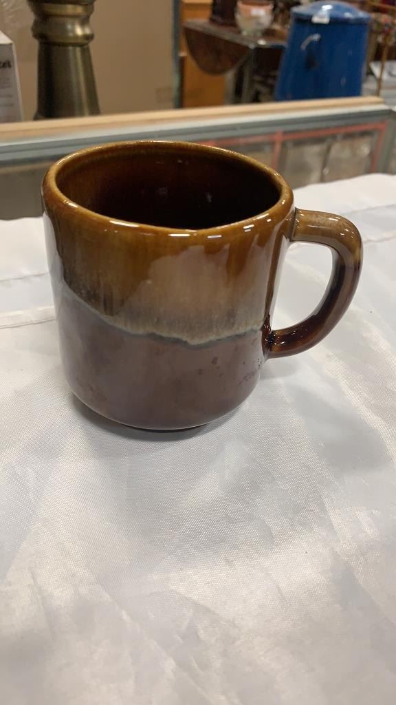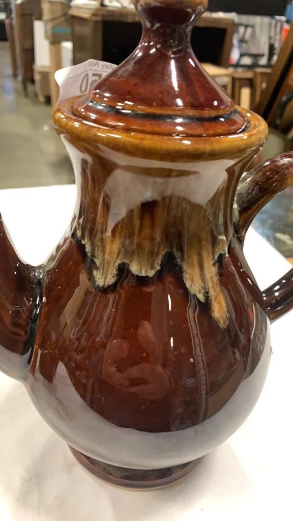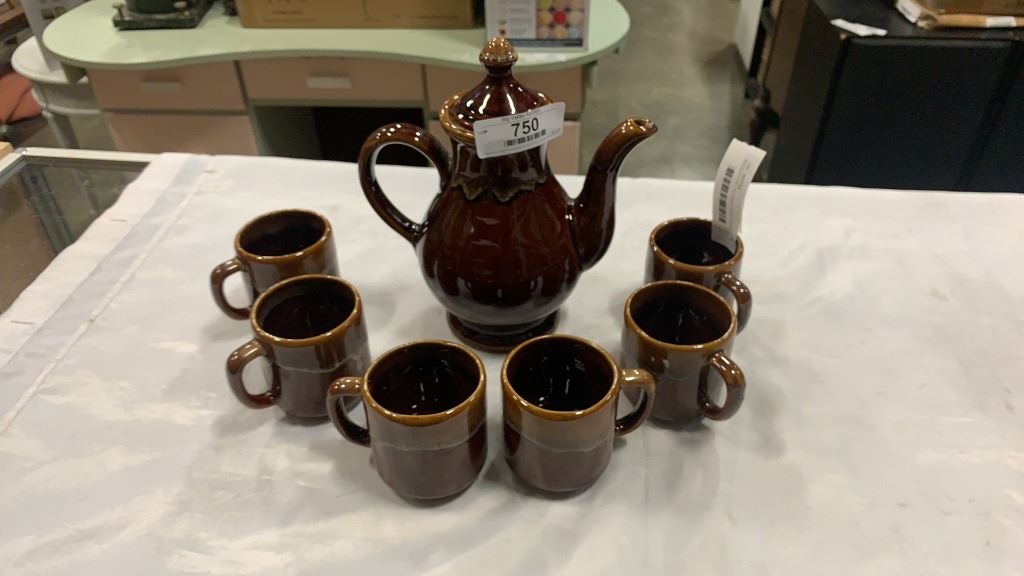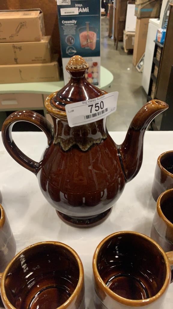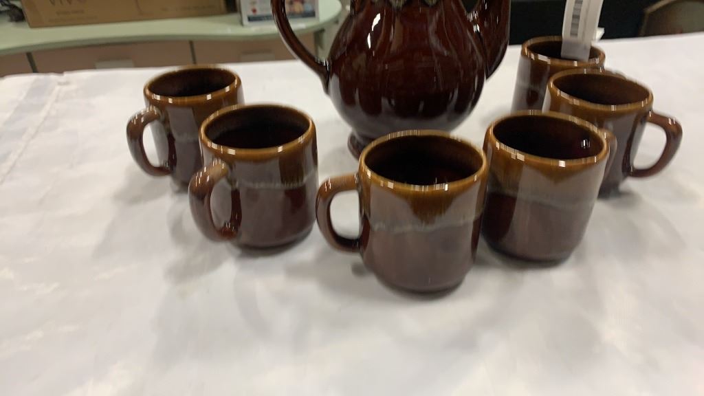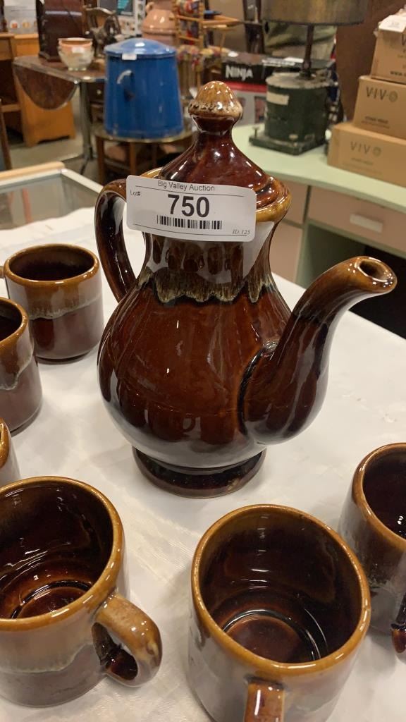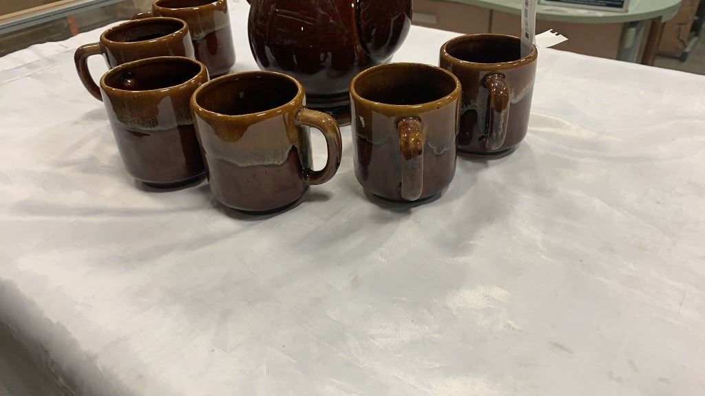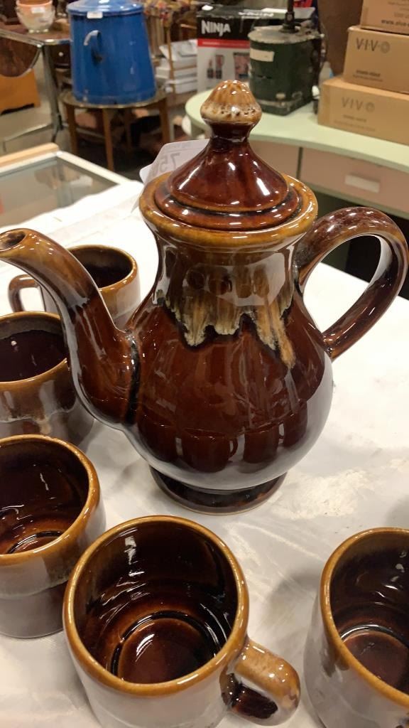 MID CENTURY POTTERY TEAPOT AND 6 MUGS
