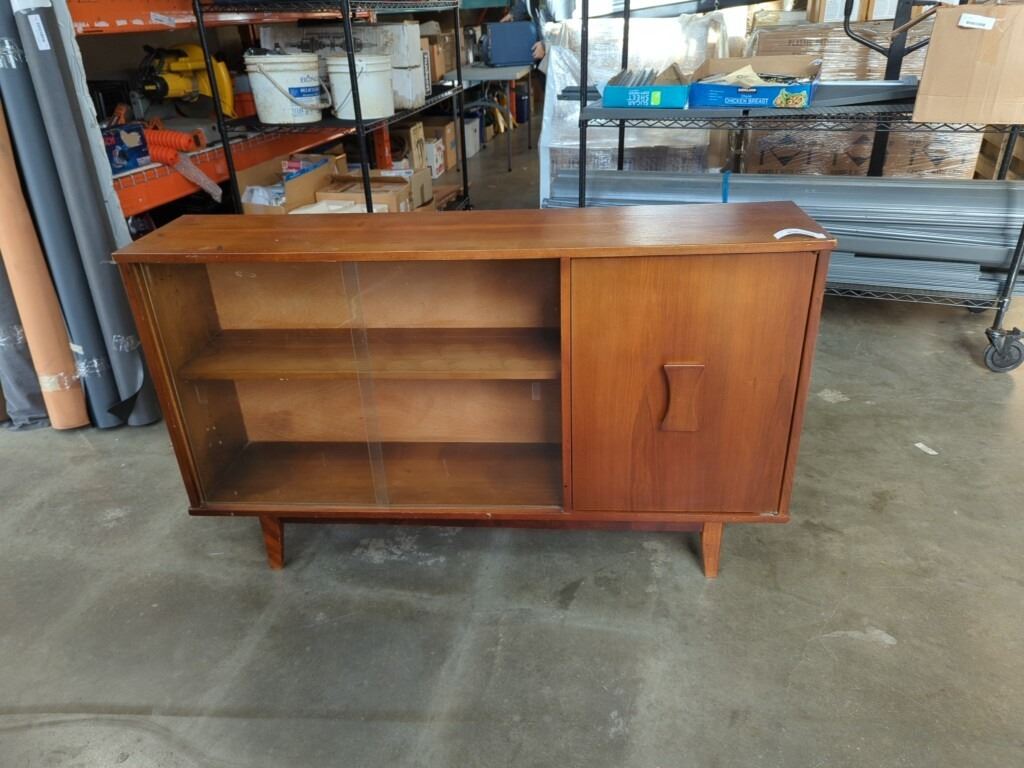 MID CENTURY TEAK GLASS DOOR CABINET