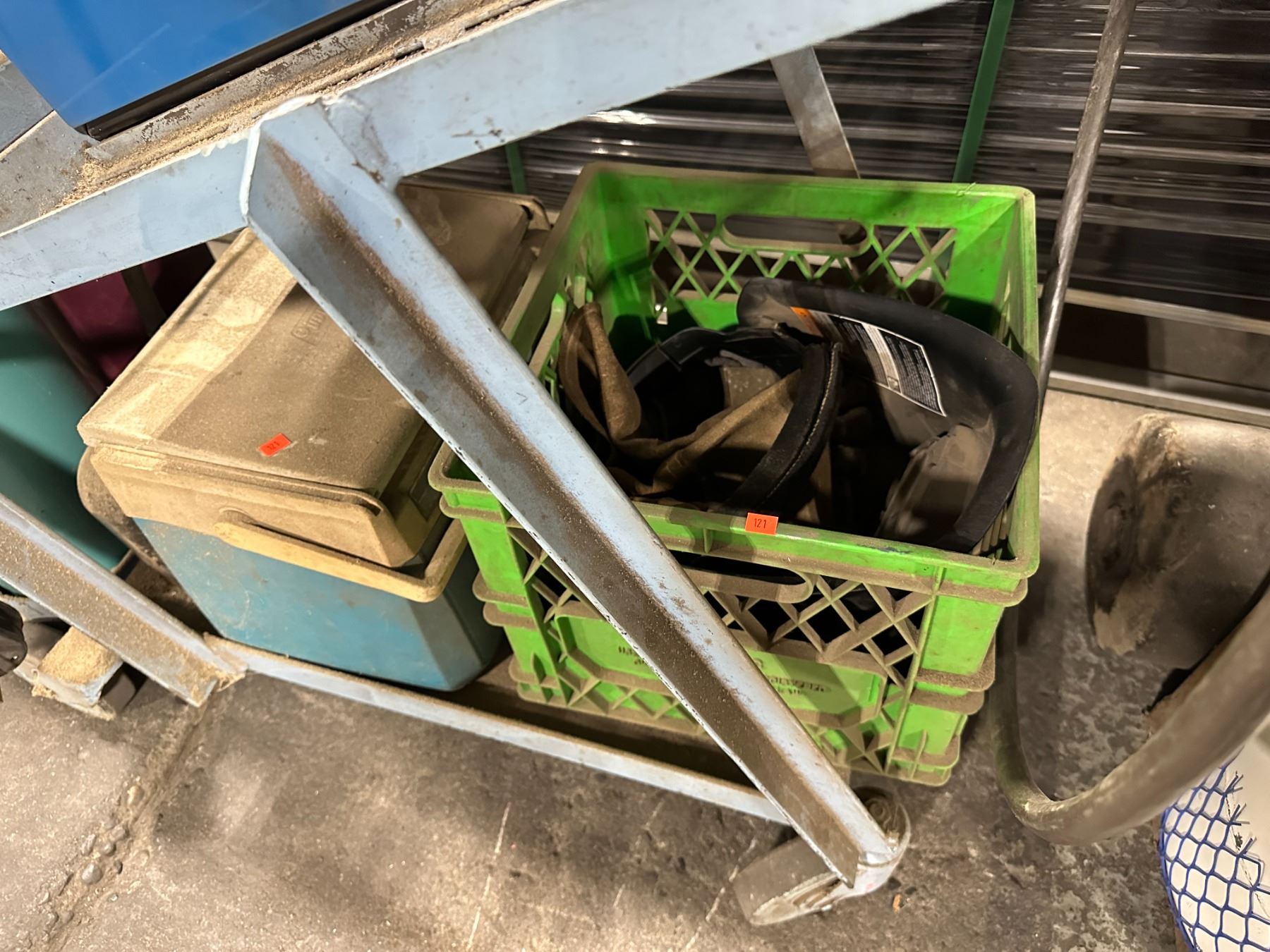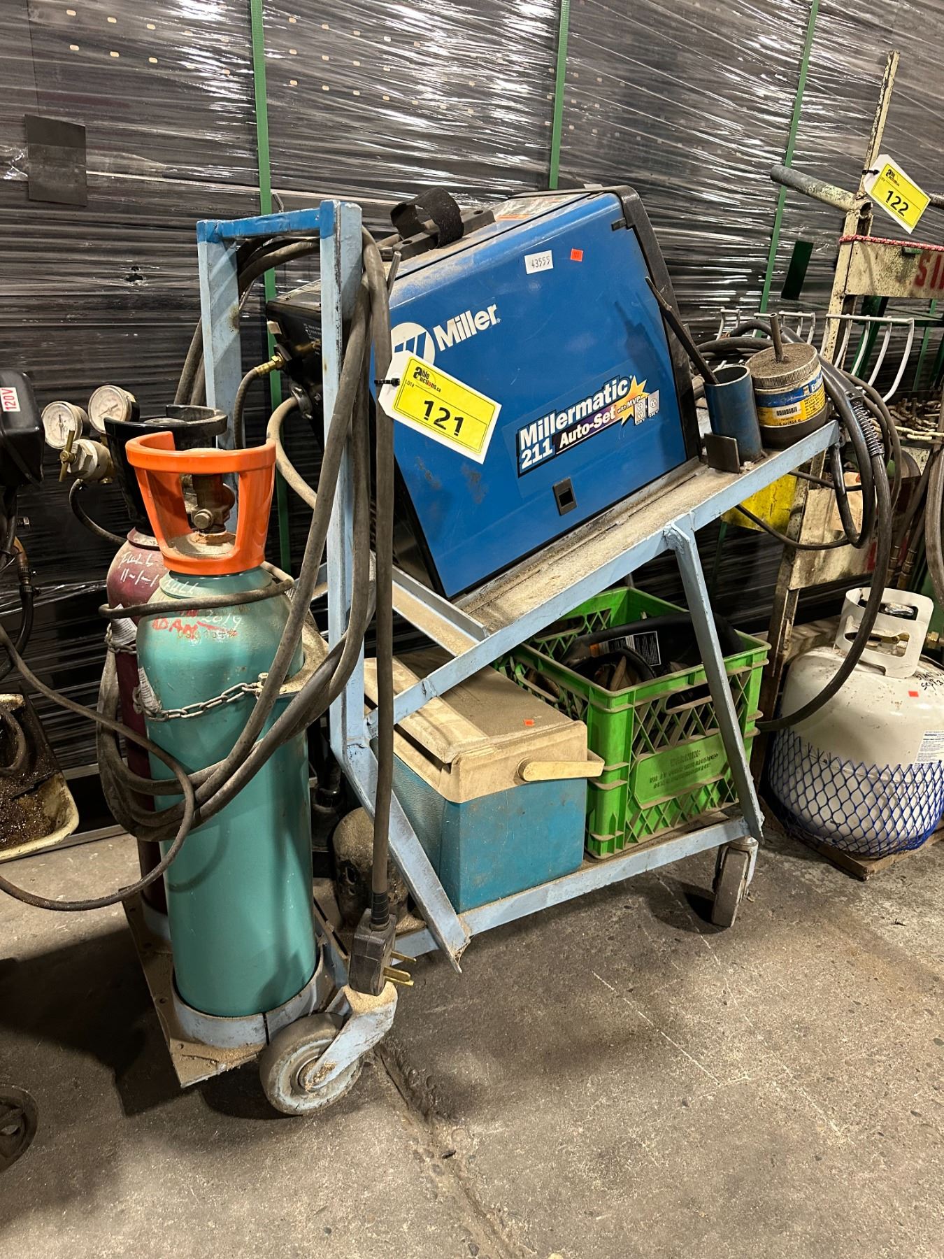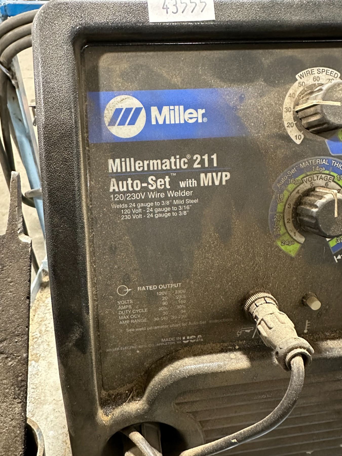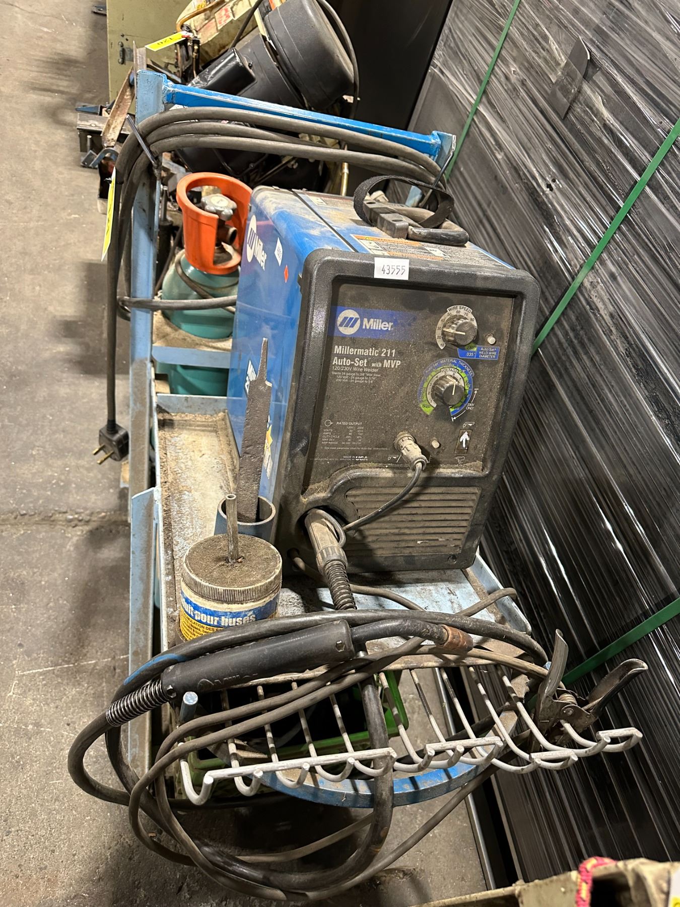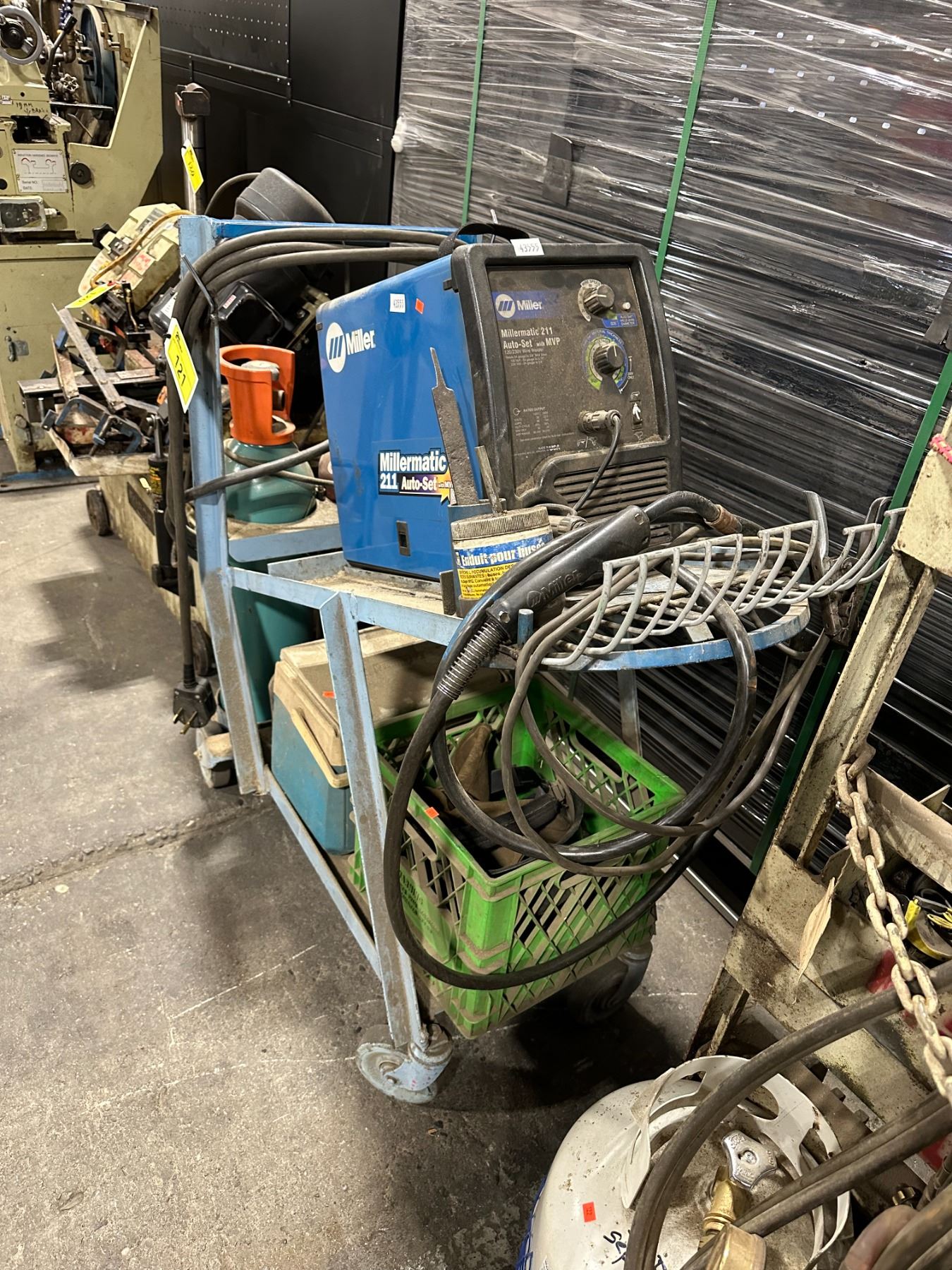 MILLER MILLERMATIC 211 AUTO-SET WITH MVP INDUSTRIAL WIRE FEED WELDER WITH GROUND, CABLE TRIGGER, & POWER CABLE ON HEAVY DUTY MOBILE CART WITH CONTENTS