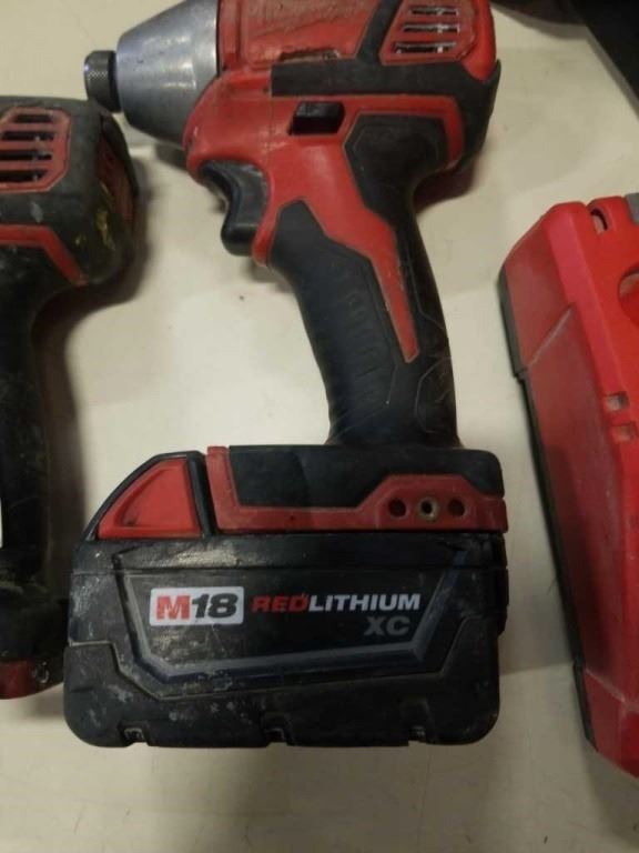 MILWAUKEE CORDLESS TOOL SET, INCLUDES 2 IMPACT GUNS AND ANGLE GRINDER, 2 BATTERIES AND CHARGER - TESTED WORKING