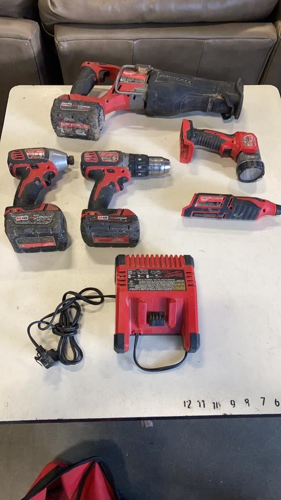 MILWAUKEE CORDLESS TOOL SET INCLUDING - M18 FUEL SAWZALL, M18 HAMMER DRILL, IMPACT GUN AND FLASHLIGHT, M12 ROTARY TOOL, TWO M18 RED LITHIUM XC5.0 BATTERIES, M18 RED LITHIUM BATTERY AND CHARGER - TESTED WORKING