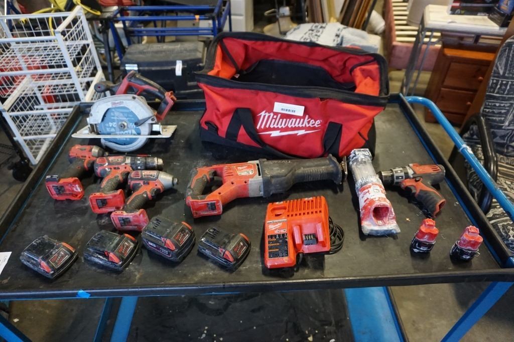 MILWAUKEE CORDLESS TOOLS SET - INCLUDES 5 M18 TOOLS; CIRCULAR SAW, SAWZALL, 2 IMPACT GUNS, DRILL AND 4 BATTERIES AND 2 M12 TOOLS; HAMMER DRILL AND LIGHT WITH 2 BATTERIES AND M12/M18 BATTERY CHARGER AND TOOL BAG - TESTED WORKING
