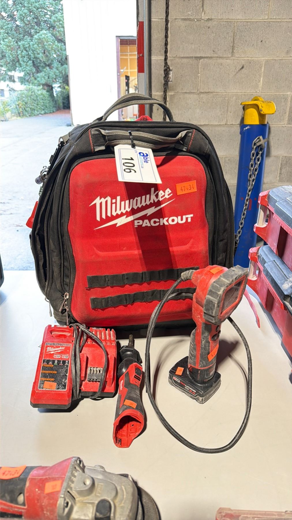 MILWAUKEE M12 CORDLESS PORTABLE INSPECTION SCOPE WITH BATTERY, MILWAUKEE CORDLESS SOLDERING IRON *NO BATTERY*, MILWAUKEE CHARGER & MILWAUKEE PACKOUT BACKPACK TOOL BAG