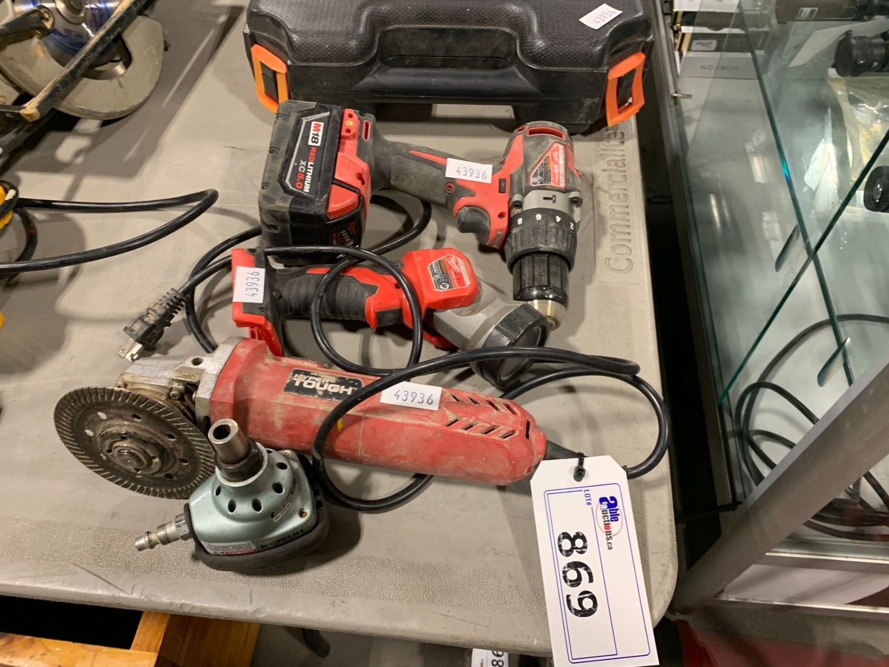 MILWAUKEE M18 CORDLESS DRILL WITH BATTERY, MILWAUKEE WORKLIGHT, HYPER TOUGH ELECTRIC ANGLE GRINDER,