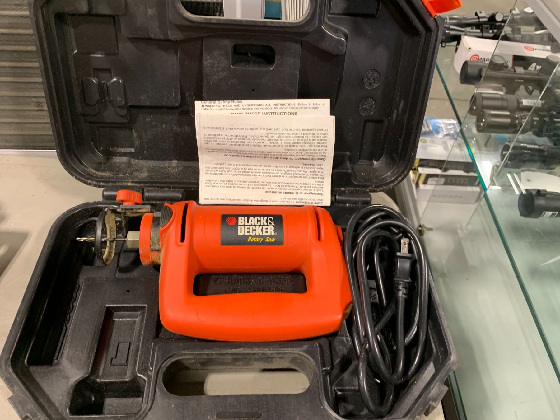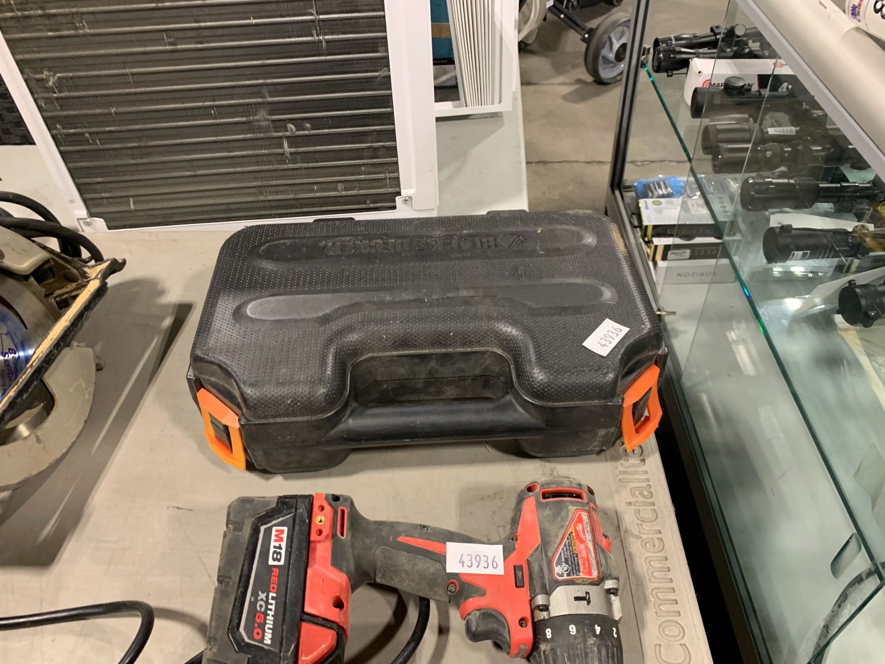 MILWAUKEE M18 CORDLESS DRILL WITH BATTERY, MILWAUKEE WORKLIGHT, HYPER TOUGH ELECTRIC ANGLE GRINDER, HITACHI PNEUMATIC PALM NAILER, & BLACK & DECKER ROTARY SAW IN HARD TRANSPORT CASE
